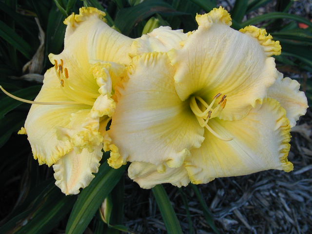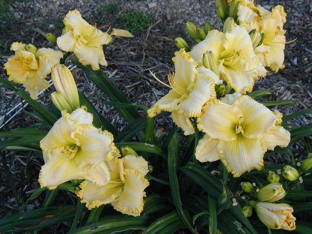 | BLINDED BY THE LIGHT TET 2301 (Larry Grace x Key Lime Ice) 18”, M, Dor, Re, fr, 6”, 4-way branching with an average of 15 buds. Pale yellow with a darker yellow eye and edge with lots of tight ruffles; green throat. Minnesota rebloomer. Very tough flower in sun, wind and rain. Shorter than I like, but blooms nicely above its beautiful foliage. A favorite of visitors. Needs cold winter to perform well. Fertile both ways. |
