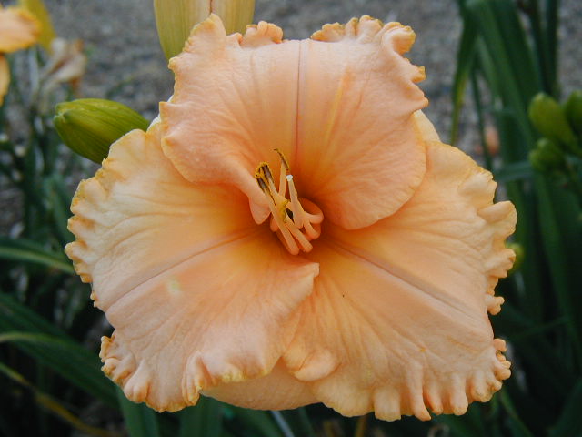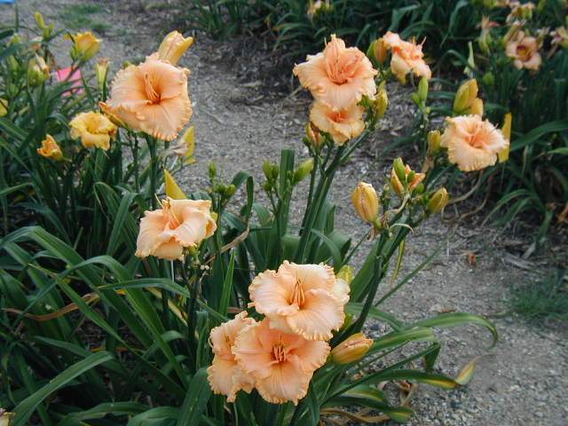 | SEVENTY TIMES SEVEN TET 42802 [(Lady Arabella x Oliver Billingslea) x {(Ed Brown x Lady Arabella) x Felicia Grace}] 30”, EM, Dor, Re, fr, 6”, 5-way branching with 2-3 well-spaced laterals with V’s and at least 20 buds. Thick, puffy pale apricot pink ivory peach with a green heart. Distinctive in its performance – consistent blooms, flowers that look great at 8PM, strong grower, terrific in a clump, reliable instant rebloomer in Minnesota (blooming for 6 weeks from early July to past mid August) and nice foliage. Fertile both ways. |