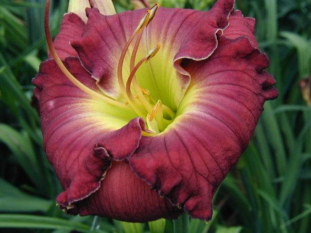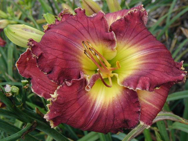 | TOWER OF BABEL TET 55202 [(Seedling x Shaka Zulu) x {(Fortune’s Dearest x Lifting Me Higher) x (Forbidden Desires x Tet Lavender Blue Baby)}] 38”, M, Dor, Re, fr, 6”, 5 way branching with 20 buds. Clear medium grape with darker feathery violet eye and edge plus a small white edge that sometimes has sharks; yellow green throat. Good for back of the border because of its height and plant habit – scapes are absolutely vertical with no arch, and blooms are way above the foliage – a bit odd, but attractive - it reminds me of lycoris (the “naked lady” plant). Fertile both ways but pod is a bit more difficult than average. |