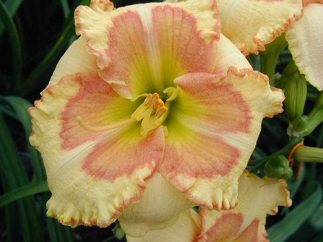 | WELLSPRING OF WISDOM TET 3199 (Wisest of Wizards x Seedling) 26”, M, Sev, Re, fr, EMO, 5”, uniform scapes with consistent 5-way branching and 2 strong laterals with average budcount of 25. Cream with large feathered strawberry eye and double edge. Minnesota rebloomer. Fertile both ways. |