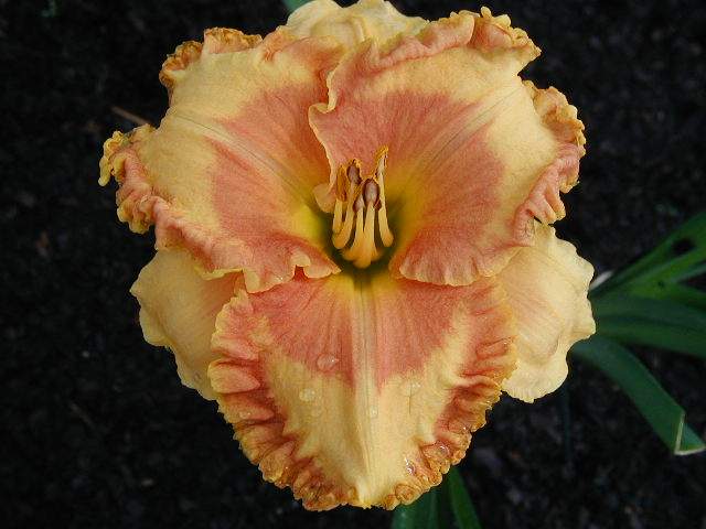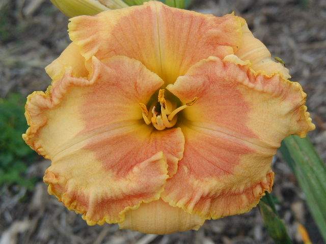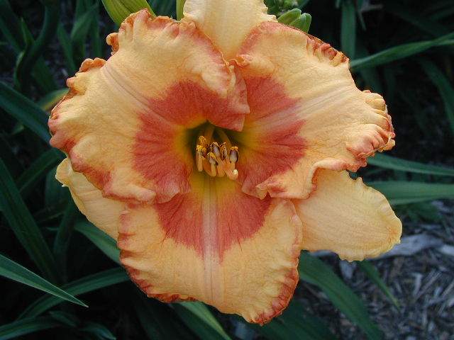 | FLIGHT INTO EGYPT TET 54802 (Touched By Grace x Raspberry Beret), 30, M, Sev, Re (but not in MN), EMO, fr, 5, 4-way branching (2 laterals plus a V at the top) with 18-27 buds (average of 25) when established. Peach with pale red eye; large ruffled pale red plus yellow edge. Small yellow throat with olive heart. Dramatic flower, but it has a flaw the first 2-3 blooms on each scape look totally boring (see last picture) dont worry, you have the right plant just give it a few days to settle in. Holds well in the sun. Great foliage. Fertile both ways.