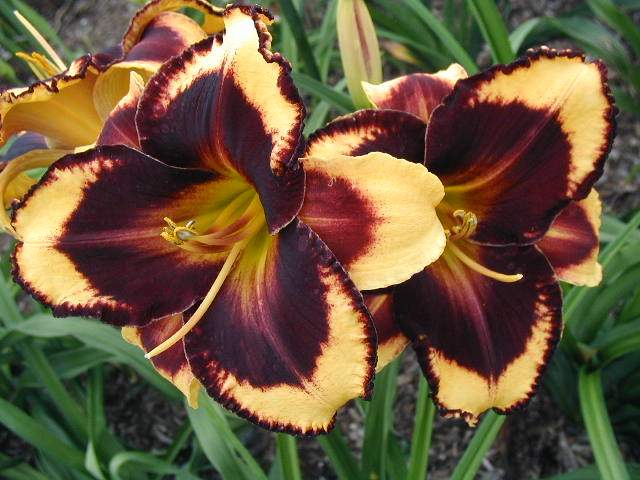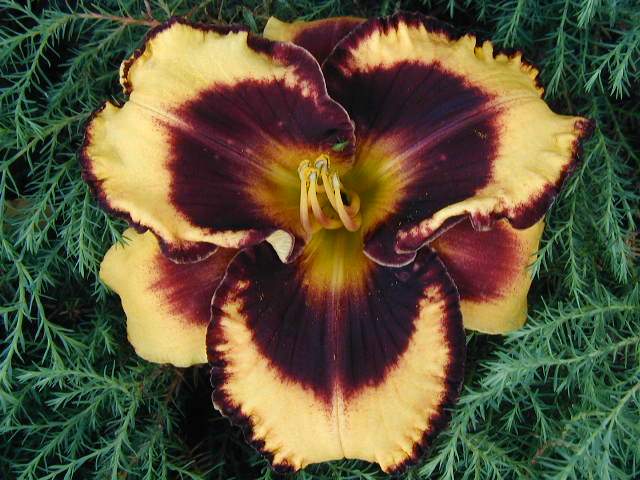 | MAGNIFY THE LORD TET 49302 {(sdlg x Desperado Love) x (Eyes on the Prize x Only Believe)}, 28”, Sev, instant MN rebloom, fr, 6”, 4-way branching (2-3 laterals plus a V at top), 15-25 buds with an average of 18. Clear golden yellow with large, distinctive black wine eye and edge with a green olive throat. Blooms show no thrip or water damage. Great foliage. Fertile both ways.