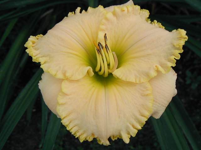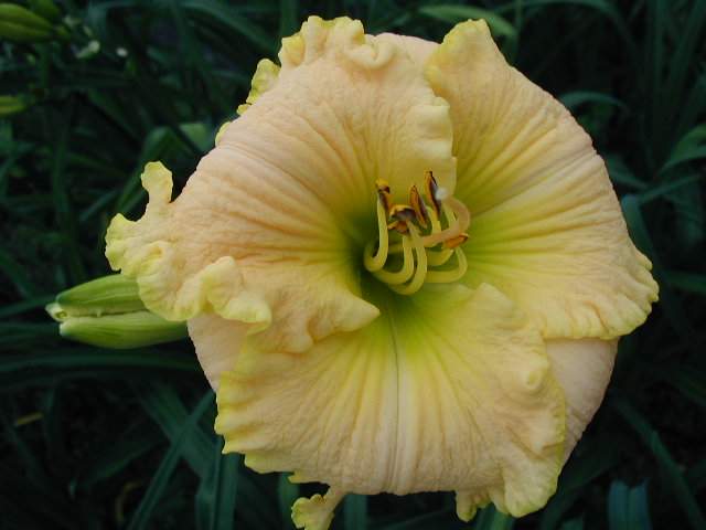 PATHWAY OF PEACE TET 42902 {No More Tears x (Clothed in Glory sdlg x Larry Grace)}, 32”, EM, reliable instant MN rebloom on every scape, fr, 5”, mixed scapes with 3-way branching and 15-20 buds (18 average). Ruffled creamy yellow with peach blush and cream midribs; yellow edge; small emerald green throat. Second picture below was taken in the greenhouse. Blooms are great early AM and late PM, and in hot sun and wind. Super foliage all season - shiny, no leaf streak. Much admired by visitors at our regional event in 2004. Fertile both ways.