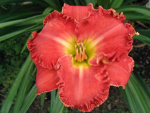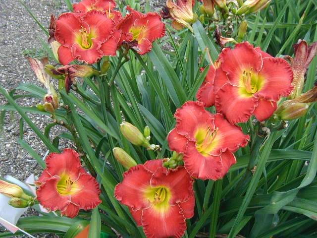 | SOUL ON FIRE TET 54102 [{(Clothed in Glory sdlg x Larry Grace) x (Seminole Wind x Better Than Ever)} x Reason for Treason], 28”, M, Dor, Re (but not in MN), fr, 5”, 5+way branching (2 lats with V’s plus W at top) with average of 35 buds (25-40+). Clear tomato red (often blood red early AM) with darker etching around lighter tomato red watermark; white “twinkle” midribs near throat; ruffled edge; mostly green throat. Consistent, flawless blooms that hover above the foliage; don’t show insect or water damage and hold great in the sun. Good opener by 8AM. Great foliage all season. Large, vigorous fans. Very fertile both ways.