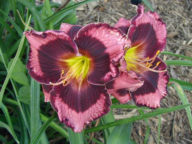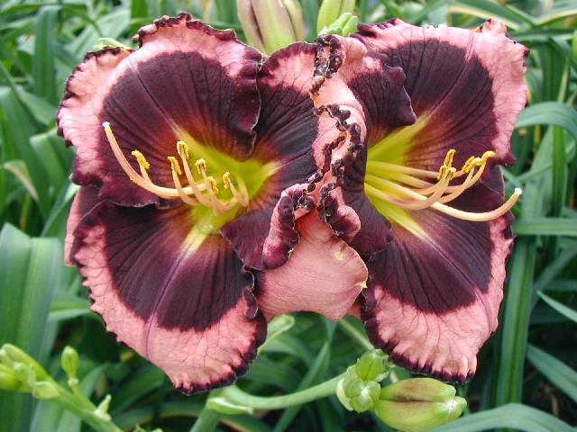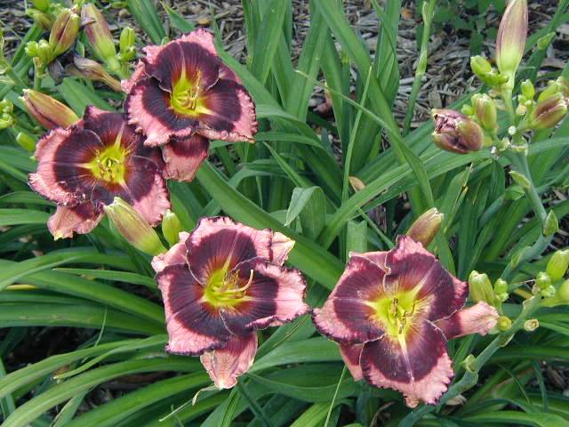 | STORM SHELTER TET 13002 {(Mask of Eternity x Eyes on the Prize) x Tet Dragon’s Eye}, 24”, M, Dor (as best as I can tell and pretty foliage in spring), Re (but not MN), fr, EMO, 5-6” blooms (avg 5”)”, mixed scapes with average of 3 way branching (1 lateral plus V with range of 2-5 way; 2 laterals plus V in GH which is what I’d guess it will be going south); 15 buds (range of 10-22; higher in GH; lower budcount and shorter in one bad winter). Round, clear light purplish pink with merlot eye and edge trimmed in white; twinkle midribs; green throat with feathers. Very hardy and long season of bloom. A really beautiful flower and a terrific parent – click on this link to see some of its offspring. Fertile both ways