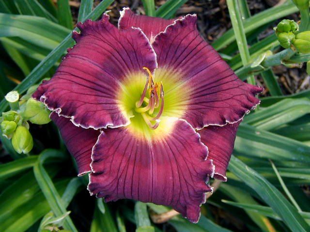| BATTLE OF JERICHO TET P859 [{(seedling x Fortune’s Dearest) x Tet Lavender Blue Baby} x Lifting Me Higher], 28”, M, Dor, instant MN rebloom, fr, EMO, 5”, consistent 4-way branching (2 lateralss plus V) and 20 buds. Beautiful clear grape purple with dark purple eye and edge trimmed in white; green throat with reddish purple feathers. Blooms consistent and unflawed – never showing water spots or insect damage; holds great in the sun and into the evening. Very hardy and very dormant despite some of its ancestors. Fertile both ways. Click on this link to see some of its offspring