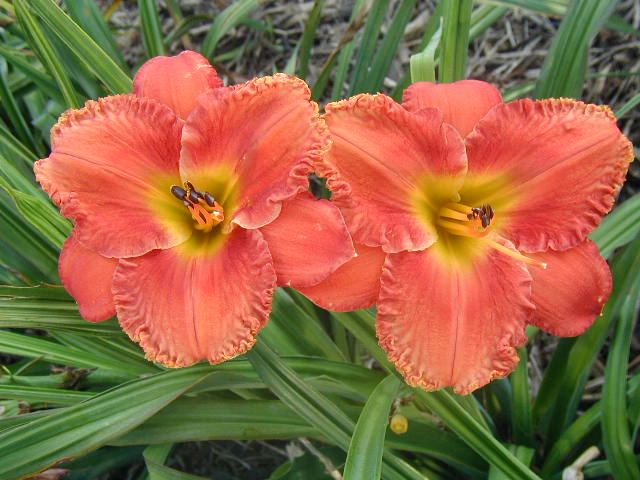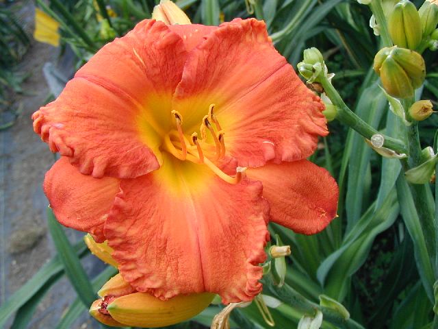 | CLASH OF CIVILIZATIONS TET 27803 (Red Loveliness x Reason for Treason), 26”, M, Dor, Re (but not MN), fr, 6”, mixed scapes with avg 4-way branching (range of 3-6 way) with 1 lateral plus W and 25 buds (range of 21-38). Orange with lighter orange halo banded faintly in darker orange; gold filigree edge; yellow to olive throat. Thick substance. Not always as recurved as pictured. Makes very large fans outside (but not in the greenhouse, although a good performer inside and out). Much admired by visitors. Nice seedlings. Fertile both ways. Click on this link to see some of its offspring.