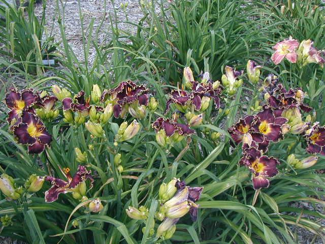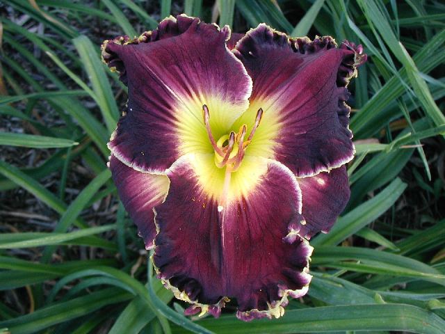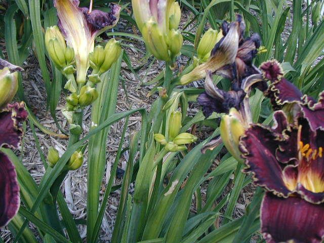 | CORONATION DAY TET 59002 [{(Breaking My Heart x Shaka Zulu) x Rock of Salvation} x Born to Reign], 24”, M, Dor, fr, very good opener but not EMO at 55 degrees, 6”, 4-way branching with 2 tight laterals plus a V and 18 buds. Dark purple with lighter purple watermark and edge trimmed in white; edge fancier/more bubbled than pictured (see clump shot on website); yellow to olive throat. Gorgeous flower and clump. Each black purple flower looks like it has a serrated white crown, and the effect is heavenly. Great color that holds well in the sun for a flower of this color. Very dormant and unhappy in the greenhouse, so not used in breeding as much as I would have liked – click here to see one of its kids. Fertile both ways.