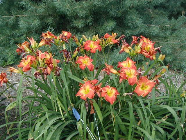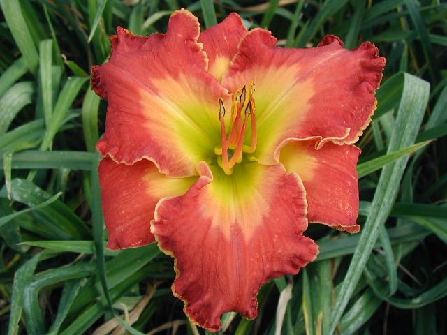 | DELIVERER TET 62602 [{ Chance Encounter x (seedling x Larry Grace)} x Reason for Treason], 30”, EM, Sev (I think – maybe Dor), fr, 6”, 4-way branching with 2 lats plus V and 26 buds (less in drought or when crowded). Burnt coral red (fades to coral salmon at day’s end) with coral pink watermark and almond edge; green throat. Diamond dusting on lighter watermark area. Fascinating face. Strong, vigorous plant with strong scapes and good foliage. One of my best performers in drought, heat, wind, sun - a consistent “deliverer”. Fertile both ways.
