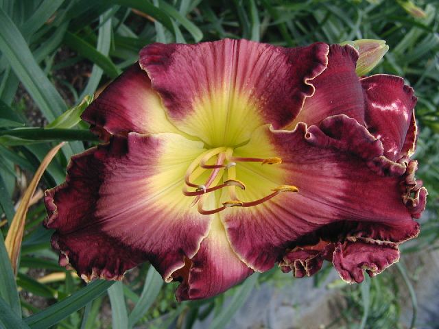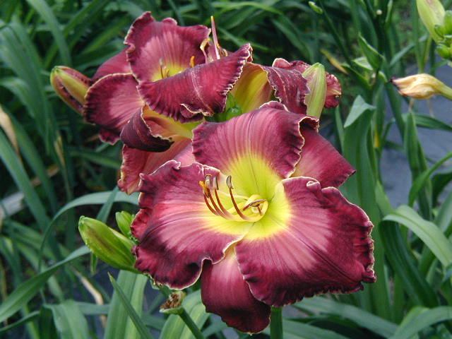 | EPHESUS TET P537 (Joan Derifield x Robed in Majesty), 28”, M, Dor, fr, 6”, 4- way branching (range of 3-5) and 20 buds. Cranberry grape with large lavender pink watermark; small white edge; yellow to green throat. Opens well. Fertile both ways and some very nice offspring with clear colors – click on this link to see some of them.