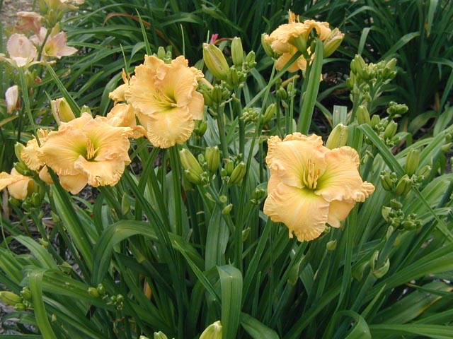| DAZZLING ENCOUNTER TET 28803 Reason for Treason x [{(Breaking My Heart x Shaka Zulu) x Rock of Salvation} x (Tim Kornder x Born to Reign)], 30”,M, Sev (I think), fr, 6-1/2”, 2-4 way branching with average of 3 way with 1 lateral plus V, 20 buds (range of 10-25). Golden yellow with thick, heavy substance that holds super in wind and rain; yellow to green throat. Nice foliage and good increaser