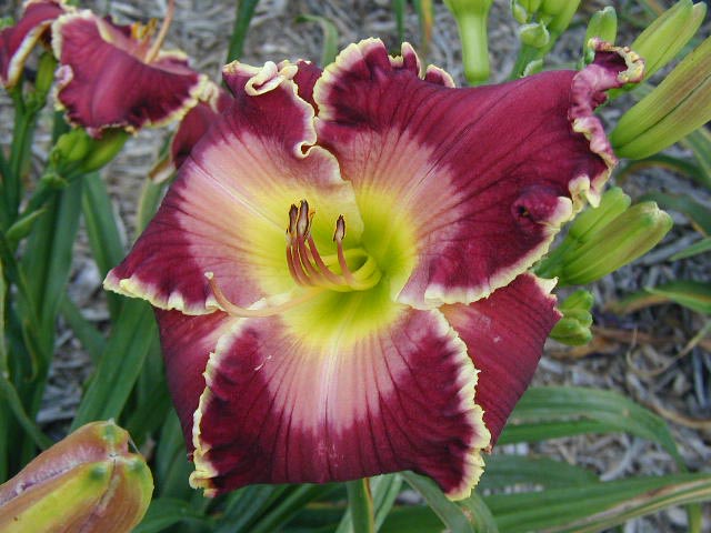 | KINGDOM WITHOUT END TET 57802{ (Tim Kornder x Born to Reign) x Darla Anita}, 26 (range of 22-28), M, Sev, instant MN rebloom on almost all scapes, fr, 6 (range of 6-7depending on recurving), EMO even on very cold mornings, 4-way branching most years with 2-lats + V (range of 3-5 way) and 5-way some years, 18 buds (range of 12-25). Clear rose cranberry violet grape with lavender wash; lavender plus ivory white edge; butter yellow to lime green throat. Edge will show sharks in the 90s. Clear color, flawless blooms on every scape on every plant every day (no spotting from rain or dew or insects), blooms for weeks, great scape, great foliage, super hardy, blossoms self-cleaning (not gloppy the next morning), perfect presentation every day. A standout from its initial bloom and a visitor magnet. Super parent, especially for white and sharky edges. Fertile both ways. As close to a perfect plant and flower that I have ever grown. VERY HIGHLY RECOMMENDED. Click on this link to see some of its offspring
