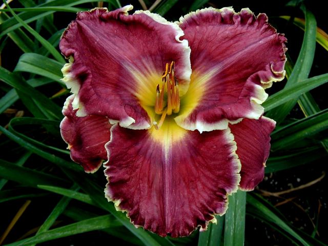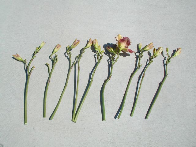 | MEGILLAH TET 25402 (Heartbeat of Heaven x Lake Effect), 32”, M, Dor, some MN instant rebloom, fr, 6”with 3-1/2” petals, EMO, 3-way branching with 1 lat + V (range of 2-4 way), 15 buds (range of 10-24). Color varies with temps – registered as grape cranberry with etched purple and dark lavender eye; twinkle midrib; lavender plus large ivory white edge; yellow to olive throat. Some days it can appear purple or dark pink lavender or cranberry lavender. Distinctive color; interesting throat; shape reminds me of a pansy with its wide petals. Glows in the sun and holds well. Starts blooming end of July in MN. Very fertile both ways.