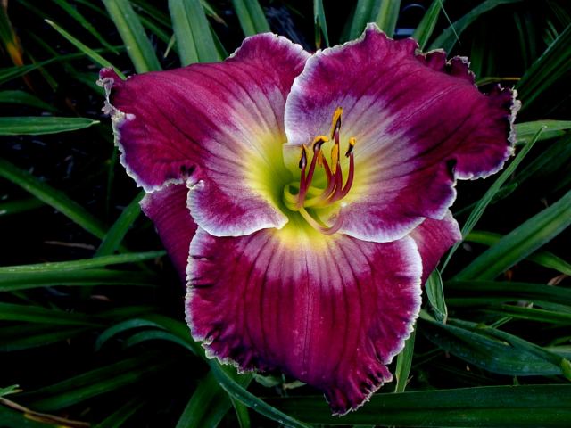 | RICH IN MERCY TET 26903[{(Chance Encounter x Shaka Zulu) x Heartbeat of Heaven sibling} x Way of Life], 28”, M, Dor, lots of instant MN rebloom and some years on all scapes, fr, 5-1/2”, 3-way branching with shape of W, consistent 15 buds. Very clear, unspotted Welch’s grape with lavender watermark; lavender plus ivory edge; yellow to lime green throat. Blooms for weeks