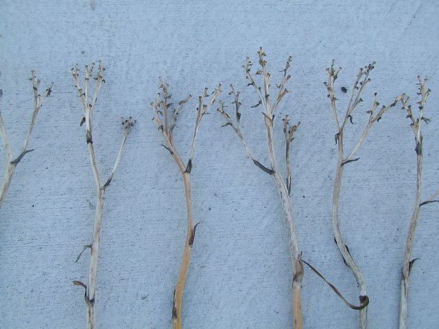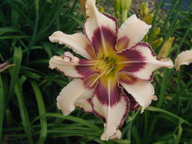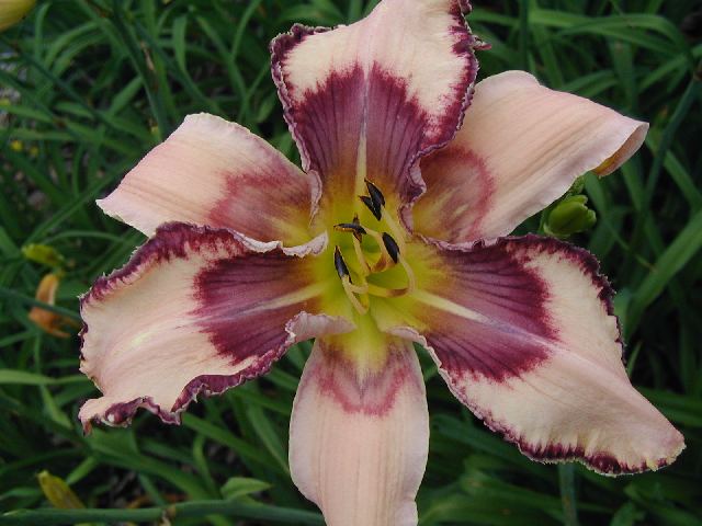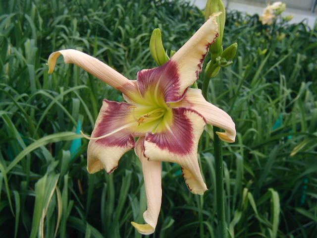 DAY OF RECKONING TET 29105 (Handwriting on the Wall x Julie Newmar), 38” (range of 36-40”), M, Sev, EMO, fr, Re (but not MN), 6-1/2”, 2-5-way branching with average of 3-way (1 lat plus V), 16 buds. Pale ivory pink; grape eye and edge with pattern on sepals; chartreuse throat. Good increaser. Often very odd shapes – see website – polymerous, twisted, pinched. Super pattern in the greenhouse – see website - but didn’t usually see it this dramatic outside. Good increaser. Fertile both ways but pod sets only about 20% of the time.