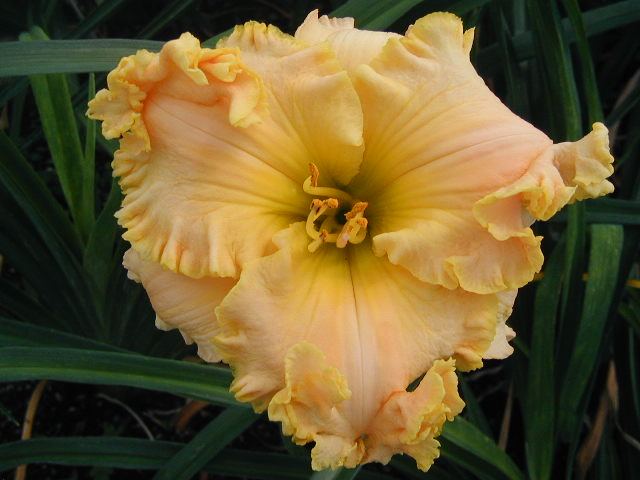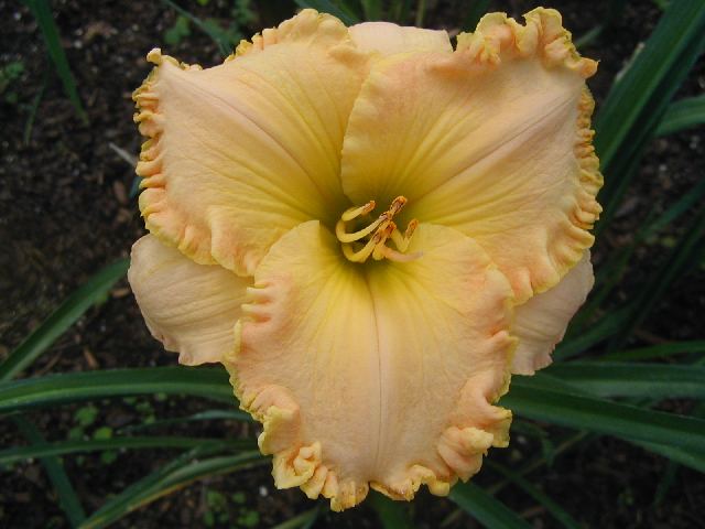 GREATEST GIFT OF ALL TET 27605 {Fear Not x (Senegal x JT Davis)}, 24”, M, Sev, EMO, fr, MN instant Re on almost all scapes (with average of 15 buds and range of 10-22), 6”, 3-way branching (1 lat plus V) that is top branched, 13-22 buds with average of 17 (note: it’s a bud-builder, so at the beginning of the season it looks like fewer than 15 buds). Pink and yellow blend; large yellow eye; blob of pink on end of petals; yellow and gold filigree edge; olive green throat. On its fancy days, it’s one of the prettiest flowers I’ve ever grown in terms of substance, look, ruffles, opening. Thick like rubber and holds all day in the sun. Good grower. Please note that at the beginning of the season (and when it’s cold) it can have totally unruffled days where it looks like a different flower - an interesting pink edge/no eye look (see website). Fertile both ways.