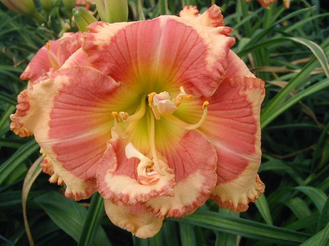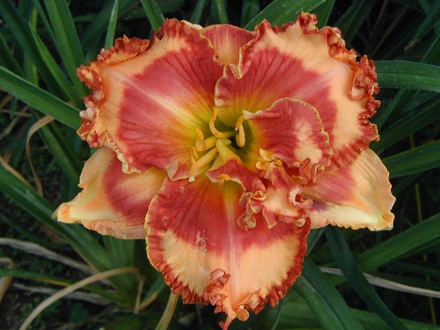 KEEP THE FAITH TET 23203 {(Light of the World x Tet Dragon’s Eye) x Only Believe x Eyes on the Prize)}, 26”, M, Dor, EMO (but not at 55 degrees), fr, Re (but not MN), 6”, 4-way branching (2 lats plus V), 20 buds. Pale pink apricot with pale red eye and thick pale red very ruffled edge; y/gr throat. Often doubles or has extra tissue. Eye-catching. Great substance and looks as good at 7:30 PM as at 6AM. Fertile both ways but pod more difficult than average. Click on this link to see some of its offspring.