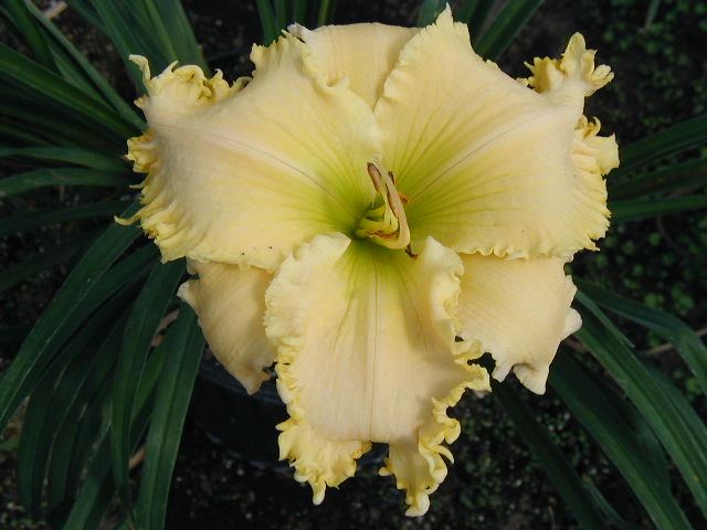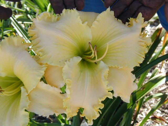 MY UTMOST FOR HIS HIGHEST TET 64504 {sdlg 35502 x (Filled to Overflowing x Heartbeat of Heaven)} – (note: sdlg 35502 is a super sharky purple which I hope to introduce in 2011 – it’s out of Lifting Me Higher, Fortune’s Dearest, Forbidden Desires, Tet LBB, and sib of Heartbeat of Heaven). 34”, MLa (starts blooming August 10-15 in Minnesota zone 4), Sev to Ev (but super hardy), EMO, fr, some Re (but not MN), 7”, 2-way branching, consistent 15 buds (additional lateral and more buds in the GH). Huge, tall, creamy yellow with darker yellow eye and green throat with lots of sharks and tendrils! A wonderful surprise out of all purple breeding – will be fascinating to see what its kids will look like given its genetic background. Slower increaser (doubles each year). Fertile pollen; pretty easy pod setter but most abort. Limited.