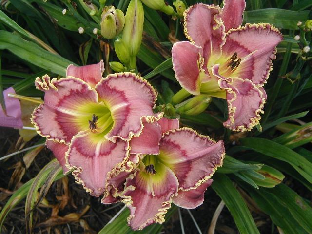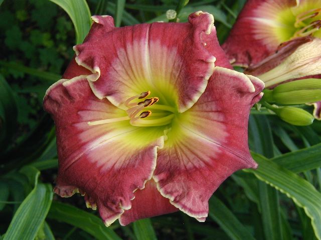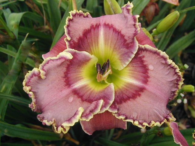PROFOUND MYSTERY TET 20105 Heartbeat of Heaven x [Tomorrow’s Glory/Absolute Treasure/Lifting Me Higher/Fortune’s Dearest sdlg x {(Tim Kornder x Born to Reign) x Born to Reign}], 28”, M, Dor, EMO, very very fragrant, Re (but not MN), 5” (up to 5-1/2”), 4-way branching (2 lat+V), 18 buds (range of 12-20). This is an exquisite flower that undergoes a remarkable transformation during the day. Pictured in the afternoon – see website for AM. Starts the day as rosy cranberry; cranberry etching with cranberry lavender watermark; small cranberry violet eyeliner+lav+ivory gold edge; twinkle midribs; y/gr throat. In the afternoon the petal color fades to cranberry lavender and the sepals stay the same color as in the morning, becoming a reverse bitone. Very, very distinctive and attractive. If you look at your flowers only in the morning, you’ll miss the fun and mystery of this flower. Fertile both ways. Click on this link to see one of its offspring.