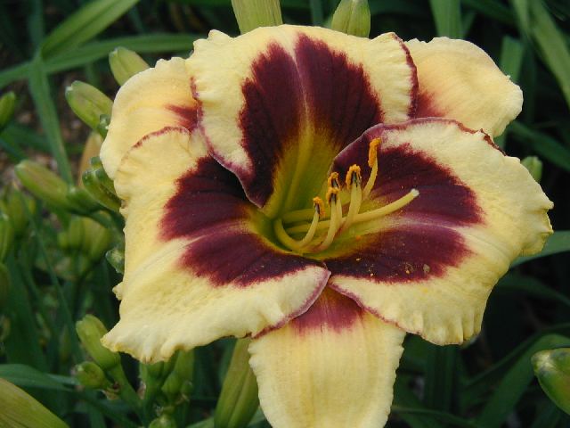 STAR OF THE NORTH TET 25500 (Mask of Time x Desperado Love), 34, M, Dor, fr, some MN instant Re some years, 5-1/2, 5-way branching (less when crowded), 30 buds. Pale yellow with purple eye; y/gr throat. Flawless blue green foliage. Yes, its pretty much a look-alike of Desperado Love, but a dormant, hardier and much faster growing version. This flower has long been a favorite of garden visitors because of its ability to grow quickly into humongous clumps visitors to the AHS National in 2007 may remember the 5 x 8 clump of it northeast of the greenhouse by the angel statue. It has been adopted as the club mascot of the Hemerocallis Society of Minnesota, but is also available to anyone else interested. Leave plenty of room. Fertile both ways.