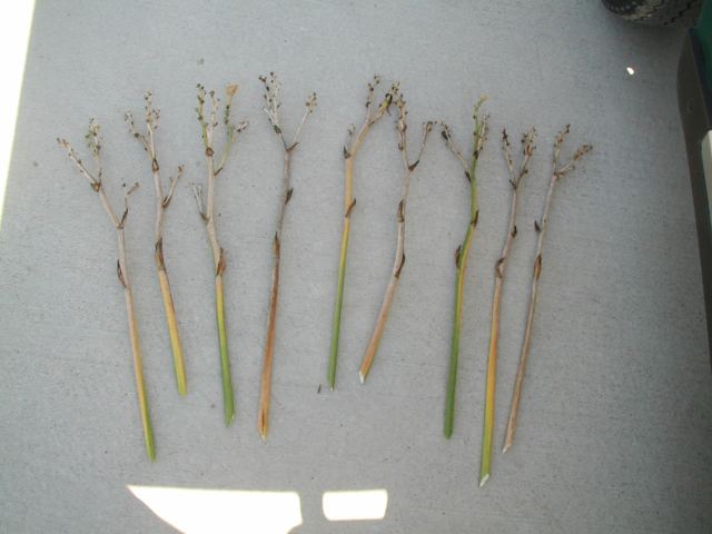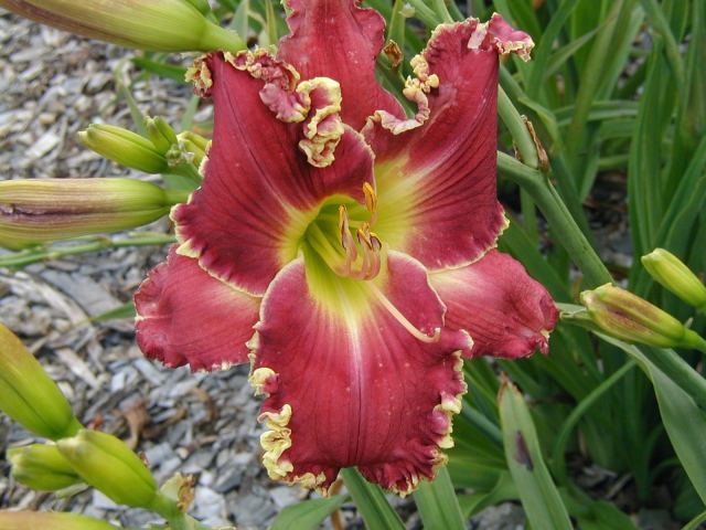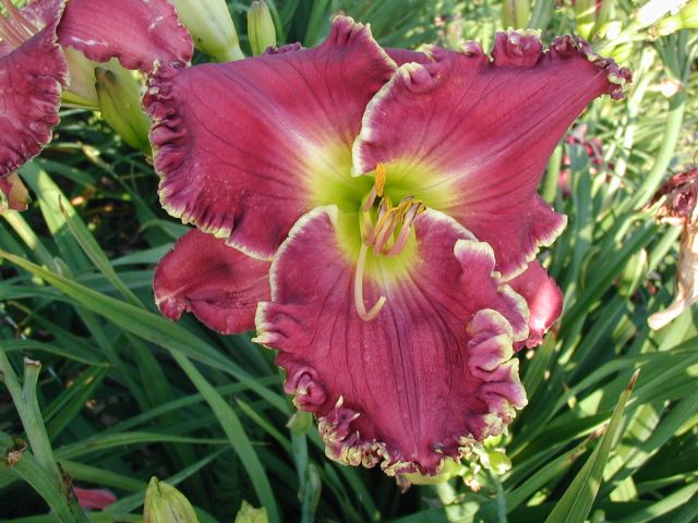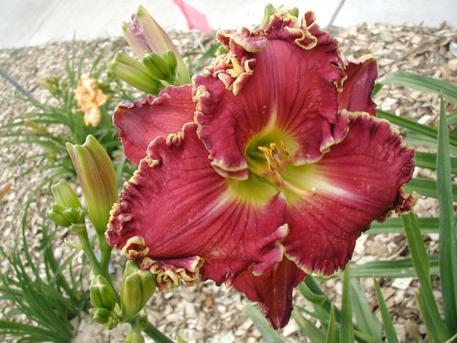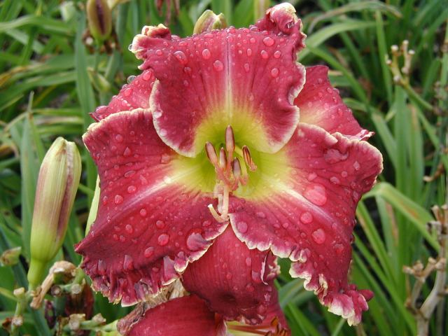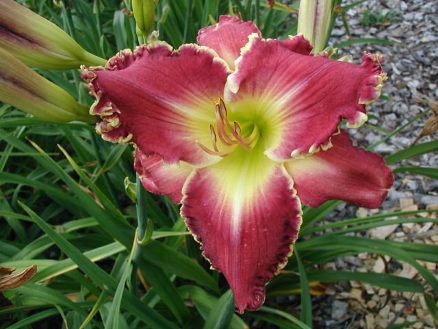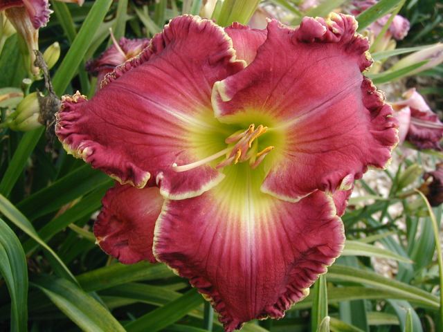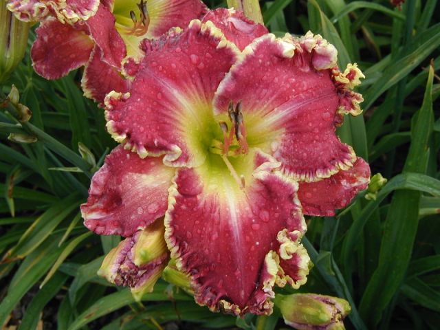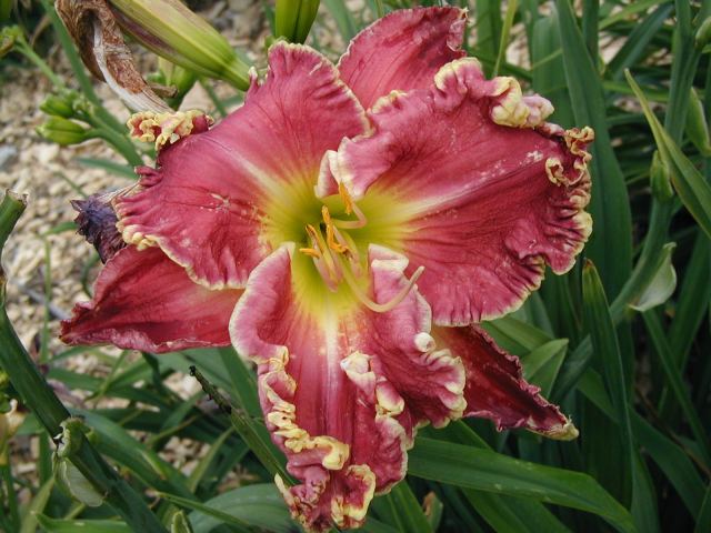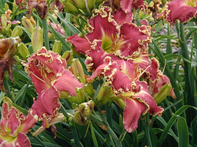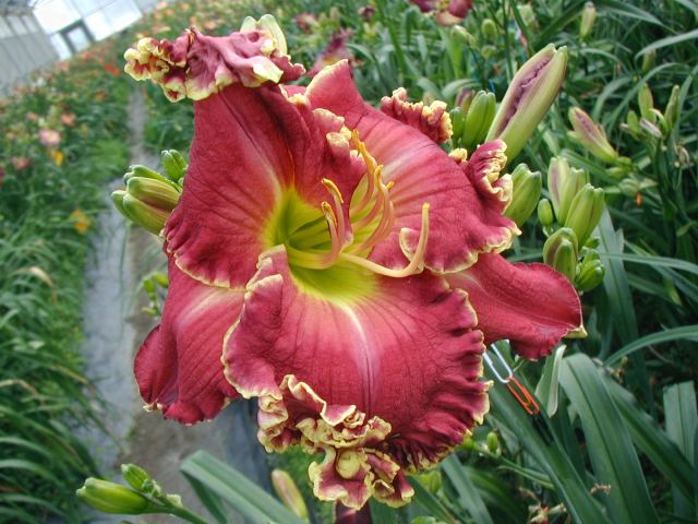 | CHARIOT OF CLOUDS TET 38104 [{Storm Shelter x [(sdlg x Tet. Lavender Blue Baby) x Lake Effect]} x (Secret of Contentment x Heartbeat of Heaven)], 34” (range of 32-36”), M, Sev (with lots of dormancy), fr, EMO, Re (incl. some MN instant Re some years), 7”, 3-way branching (1+V or W), 17 buds (with range of 10-20). Dark hot cranberry rose with darker rose eye, pink lavender watermark, pink lavender edge trimmed in ivory, yellow to green throat. I have taken almost 100 pictures of this one and every bloom is different, ranging from super-ruffled and absolutely stunning to less ruffled to gnarly; from flawless to spotted; from triangular to round. Because of this inconsistency, I would say it is more of a hybridizer’s plant – at least in zone 4. Amazing in greenhouse (see last picture) and lots more buds. Very powerful parent and highly recommended as a way to get large, ruffled, hardy flowers with great color (mostly cranberries, hot pinks, and purples). Thanks to this flower I now have a wonderful pink program. Click here to see pictures of some of its kids. Click here to see pictures of grandkids (from one of its kids -17106). And click here to see some great-grandkids. Fertile both ways.