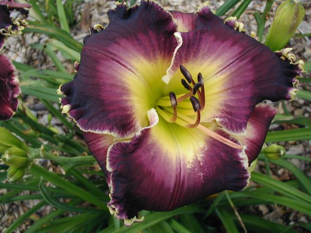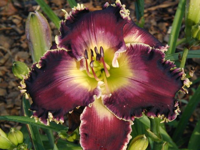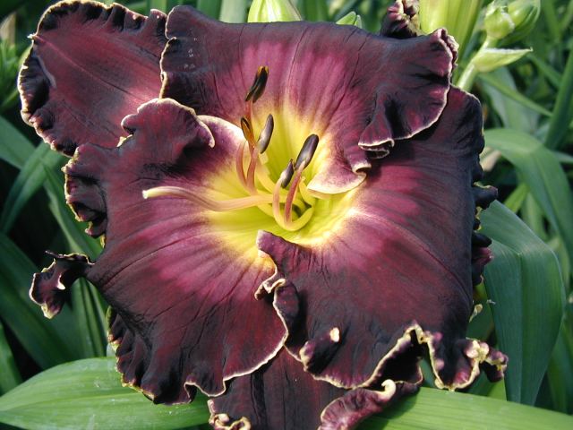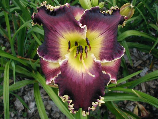 dark purple with lighter lavender purple watermark, yellow to green throat, trimmed in