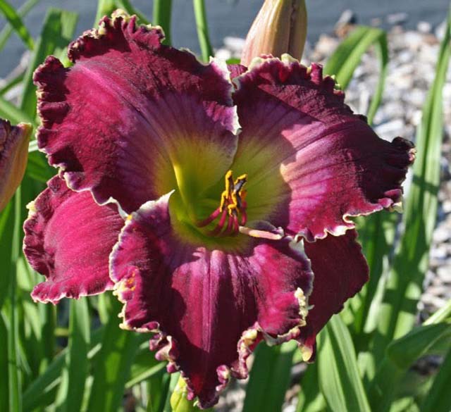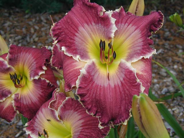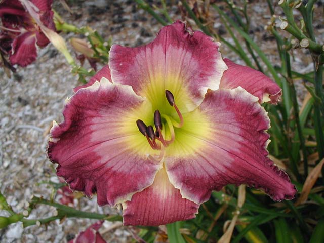 | ARMED FOR BATTLE TET 67004 [Way of Life x Enduring Freedom]. 6”, 38” (range of 36”- 40” depending on the year), 4-way branching with 2 laterals and a V, 25 buds (range of 15-30), Dor, M, instant Minnesota rebloom on almost all fans each year (resulting in a very long bloom season), fr. Medium magenta grape with gray lavender eye; gray lavender plus ivory toothy edge; yellow to green throat. EMO and CMO. Beautiful in all temps. Much darker and less of an edge in cool weather, but even prettier color then. An easy opener, even when morning temps are in the 50’s (like at the national convention this year! - see picture #4, which was taken by Julie Covington). Only shows the bigger toothy edge on warm days (in the 80’s). Very hardy. Fertile both ways.