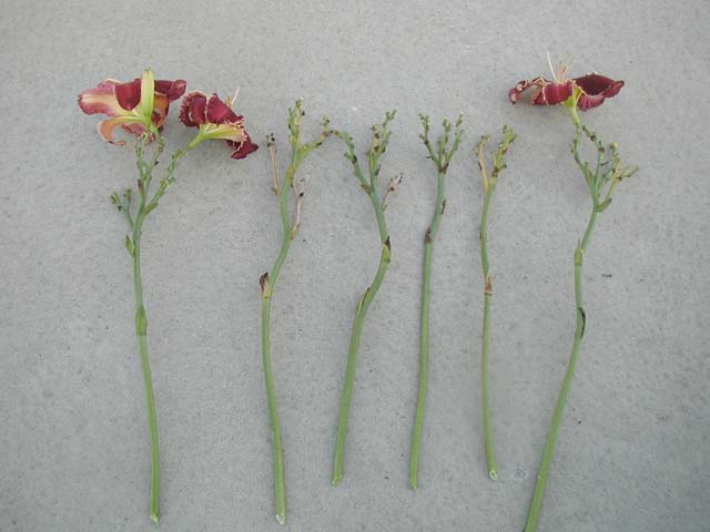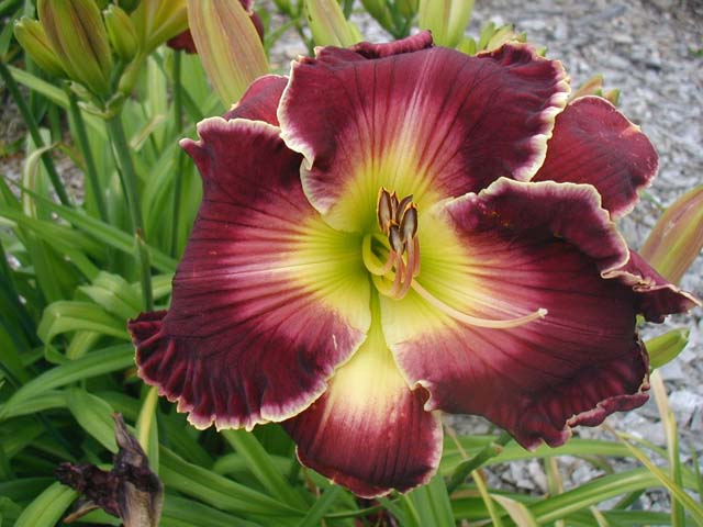 | ROBED IN SPLENDOR TET 46006 [Kingdom Without End x Sermon on the Mount]. 7”, 30’ (range of 28-35”) plus flower, 3-way when crowded and 4-way when not (range of 3-6), 15 buds, some Minnesota instant rebloom, LM, Dor (I think). Grape cranberry (Welch’s grape when cold), pink lavender eye and edge plus ivory, yellow to green throat. Starts blooming here in late July or early August and it is a star of the August garden with its clear, unspotted, large, beautiful blooms that last for weeks. No idea on fertility, but no problems with its parents.