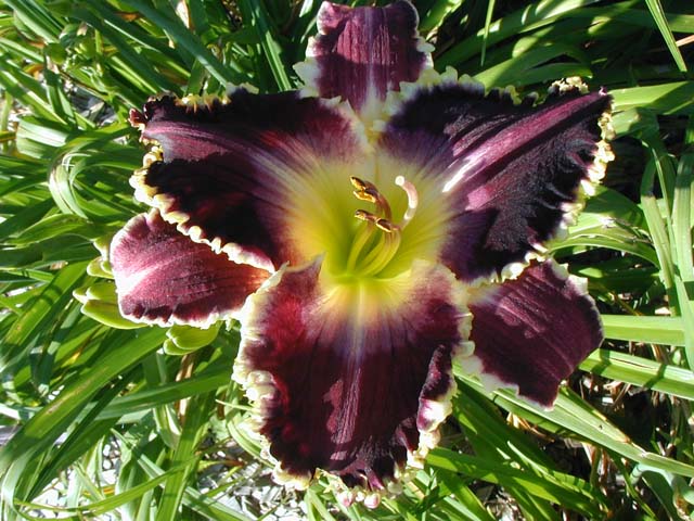 | TEETH OF IRON TET 19707 [Kingdom Without End x Skin of My Teeth]. 6", 30" (range of 28-32” plus bloom), 3-way, 13 buds (range of 10-18, rebloom (but not in Minnesota), M, Sev. Clear dark purple, etched lavender eye, yellow to green throat, white sharky edge. Gorgeous color plus edge that calls to you from a distance. Consistent performer year to year. What’s not to like? Bud count and rate of increase are below what I would like to see in my introductions, but it’s a gorgeous flower and a good plant that also produces sharky kids with great color – Click Here to see examples. Fertile both ways, but pod more difficult than average.