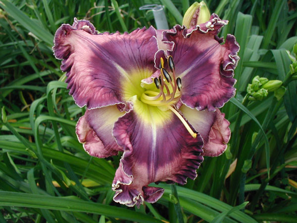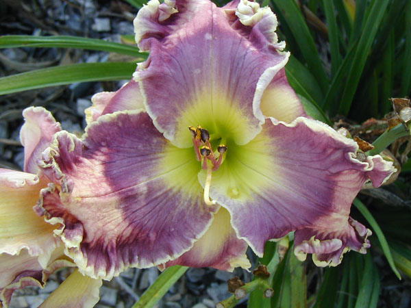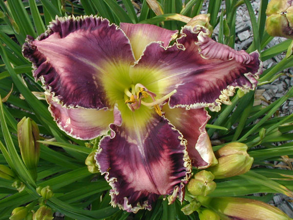 Lavender pink with etched neon violet lavender eye and edge; chartreuse throat. Easy opener but not quite an EMO. A “show stopper” in the greenhouse on a beautiful scape, but low budcount outside in zone 4 and inconsistent flower form and color. Fertile both ways. A fabulous parent for large (7-8”), gorgeous, hardy, distinctive flowers (although often with a budcount of 10-12). Will breed patterns, especially several generations down the line (see link to kids on website). Although not a spotter itself, some of the kids are, so be careful what you use it with. Numerous grandkids and great-grandkids etc. will likely be intros in future years, but I’ve had a lower than expected probability of an intro in the first generation, where I get killer faces with only 10 buds, or plants with tons of buds but some spots or tangles. I know the right stuff is in there, but haven’t figured out the key to easily unlocking it in the first generation. Perhaps you will be able to. Because it is not a good garden flower in zone 4, it is available only as a GIFT (with a $300 order) to anyone who would like to use it for breeding – but you must indicate on your order form that it is for your personal use only and not to be sold or given as a gift. Hopefully, it will perform a lot better in zones 5 and up (let me know), and some will wonder why in the world I gave it away as a gift? If there are enough reports and pictures over 2-3 years in warmer zones that indicate it would meet my standards in those zones, I might allow it to be more widely distributed.