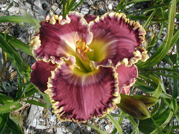Grape lilac cranberry with cranberry etched gray lavender eye and edge plus ivory; yellow to green throat. Consistent form. Often reverses color between self and eye, although not within the same day like its parent Profound Mystery. Consistently strong through the testing years including the malaise. Beautiful healthy foliage. Long bloom season. Easily fertile both ways.