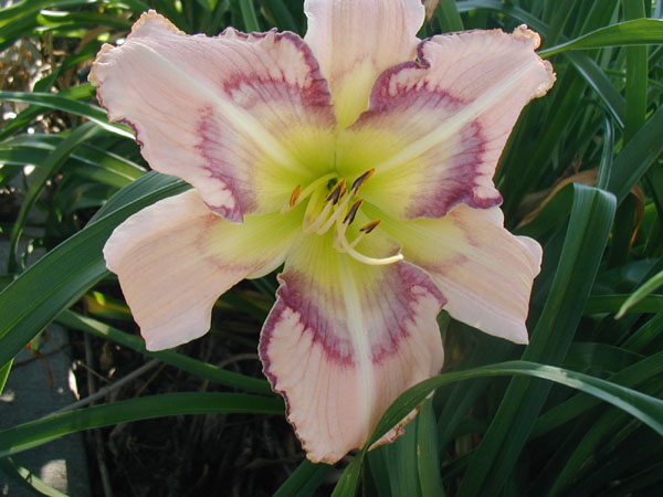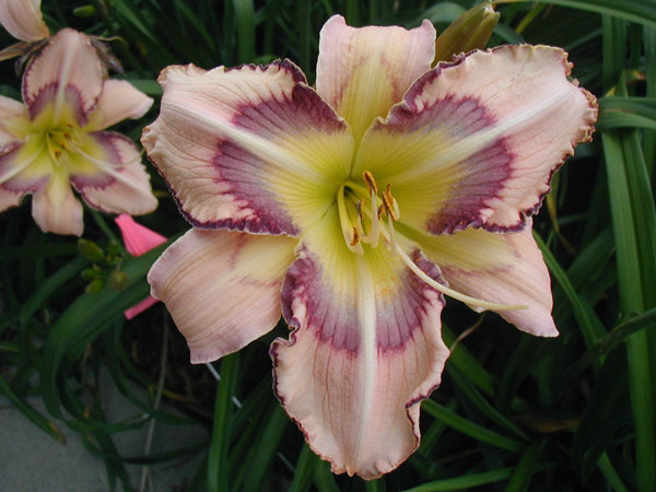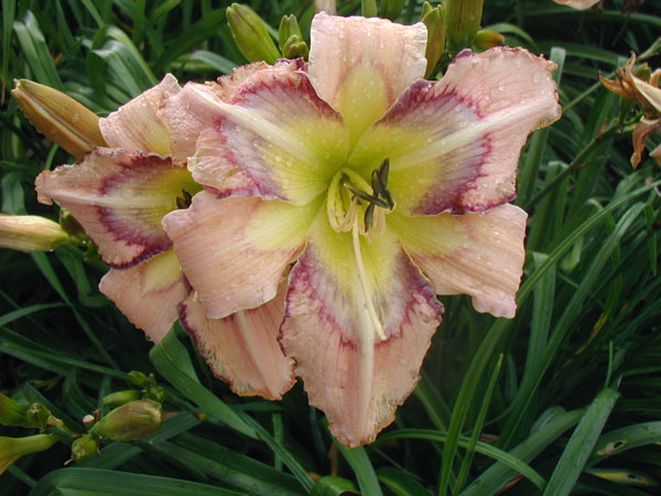 RAINBOW IN THE CLOUDSTET 10207 [Lake of Fire x Entwined in the Vine], 6.5” (with a range of 6.25”-7.5”), 32” (35” including the flower), 4-way branching (range of 3-5), 15 buds (range of 9-20), Dormant, M, fr, EMO, CMO, Re (but not MN).Pale lavender pink with violet etched multi lavender eye, violet plus light lavender edge, green throat. Eye is sometimes feathery, metallic, and/or patterned. Pollen easily fertile; pod fertile but not easy.