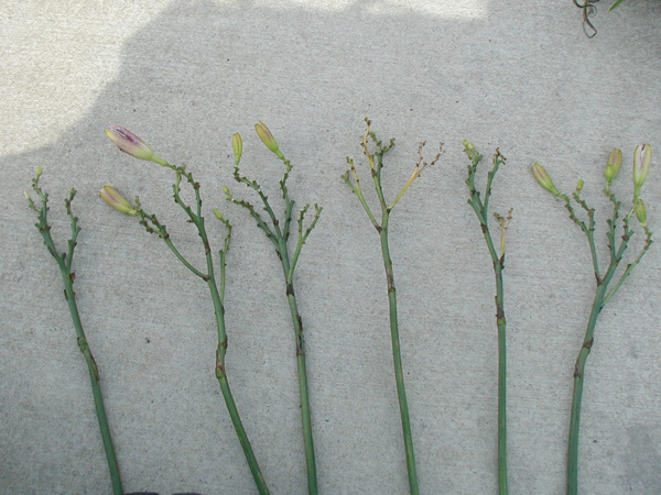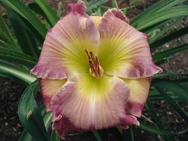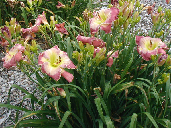 CAUGHT UP IN THE CLOUDSTET 68609 {(sdlg x Desire of Nations) x [sdlg x(Chariot of Clouds x Skin of My Teeth)]} where the sdlgs include a wide diversity of plants including Filled to Overflowing, Way of Life, Light of the World, Remembering Joan, and even J.T. Davis. 5.5”, 40” (with a range of 30-42”), 4-way branching (with a range of 2-5 way; average of 3-way when crowded), 24 buds (range of 13-24) in a crowded clump, ML (blooms here all of August and into September), EMO, CMO at 50 degrees, Sev (I think), fr., no rebloom noted.Pale cranberry lavender grape; chalky lavender eye and edge; yellow to green throat. Bouquet bloomer for weeks, and looks like a cloud floating in the garden. Sometimes blotches after rain. Looks like a Munson on steroids with great garden value year after year