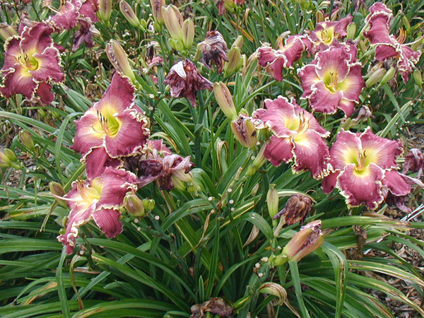 Cranberry violet; chalky lavender watermark; chalky lavender plus ivory edge with some sharks; yellow to green throat. Very tough, reliable plant with beautiful color. Grown on steep north slope battered by wind. No idea on fertility since always an outside plant, but pollen looks good and parents easily fertile