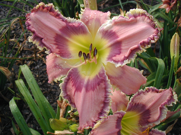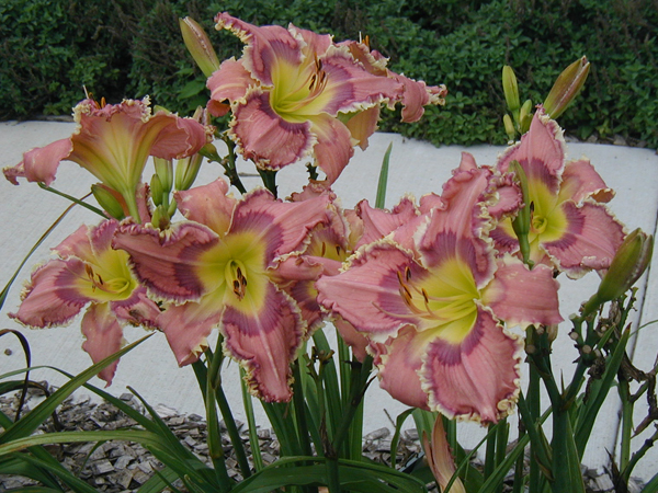 TET 14910 {[(Entwined in the Vine x Intelligent Design) x (Inscribed on My Heart x Entwined in the Vine)] x All Things to All Men} 7” (often 7.5”), 28” (range of 24-30”), 4+ way branching (range of 3-7; less when crowded), 20 buds (range of 13-31; less when crowded), EMO, CMO, ML, Sev, MN instant Re on some scapes in some years (on all scapes in GH), fr. Lavender pink;