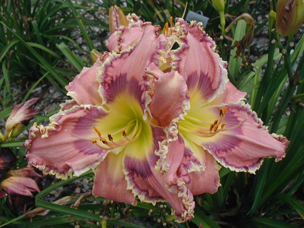 A cranberry grape plus dark lavender eye; cranberry grape plus dark lavender edge plus ivory sharks on both petals and sepals; chartreuse throat. I LOVE this gorgeous flower. Easily fertile both ways. Click here to see a picture of one of its kids. I didn’t use it much since I don’t have many things that are similar to it. Will correct that in 2017, including putting it with my toothy purples
