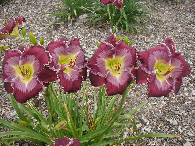 FINAL CONFLICTTET 39409 (Gnashing of Teeth x sdlg) x Desire of Nations, where the sdlg includes Regal Majesty, Clothed in Glory, Remembering Joan, Heartbeat of Heaven, Breaking My Heart, Shaka Zulu, and Rock of Salvation. 6", 34", 3-way branching (range of 2-3 way), 18 buds, ML to Late, Sev, some Minnesota instant rebloom some years, fr.Gorgeous flowers with no spotting. Almost an EMO. It almost didn't make the cut because it is slow to increase (so I have a very limited supply of it). But it made a stunning clump during its test period once it got going and is the parent of some outstanding kids, so I thought it worth introducing. Dark burgundy with icy gray lavender eye; icy gray lavender plus ivory edge; chartreuse throat. Easily fertile both ways.