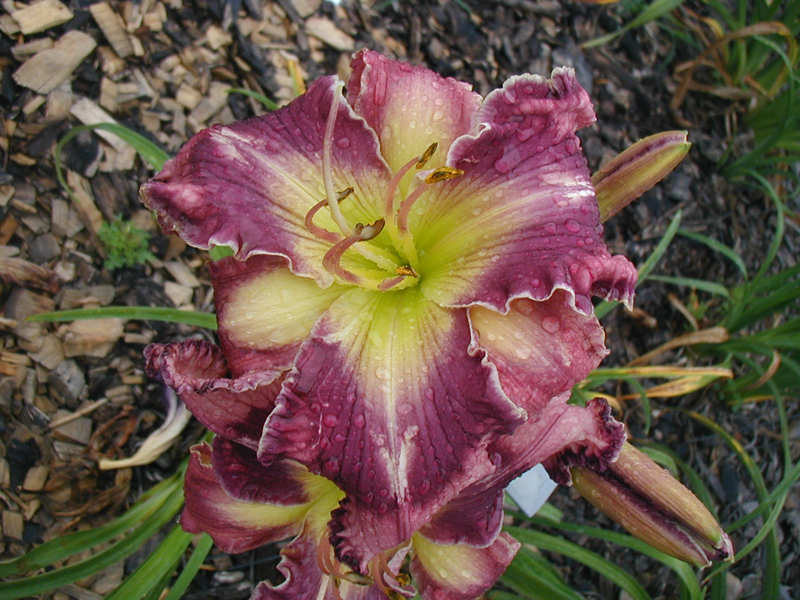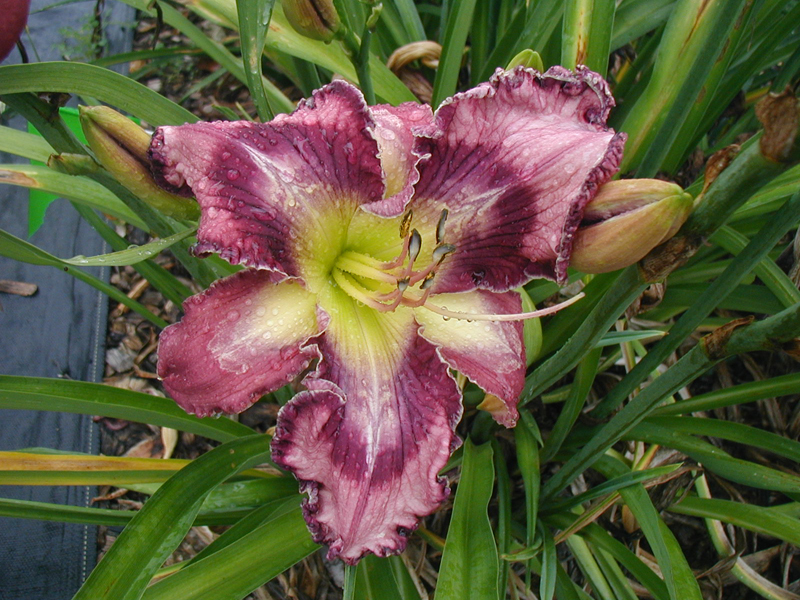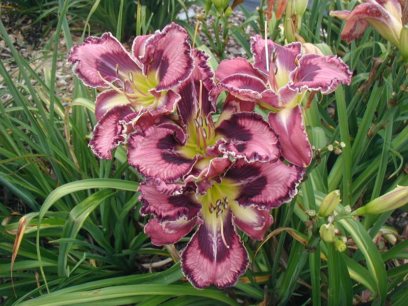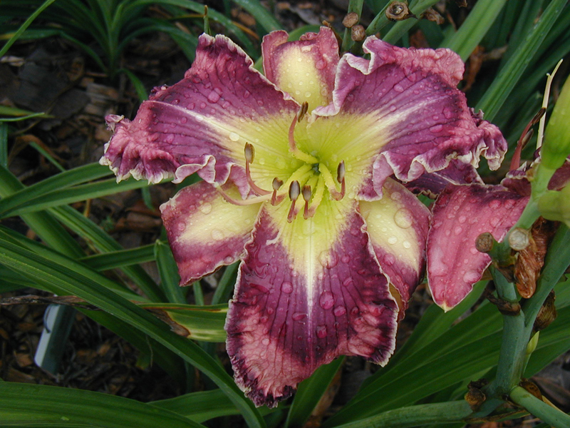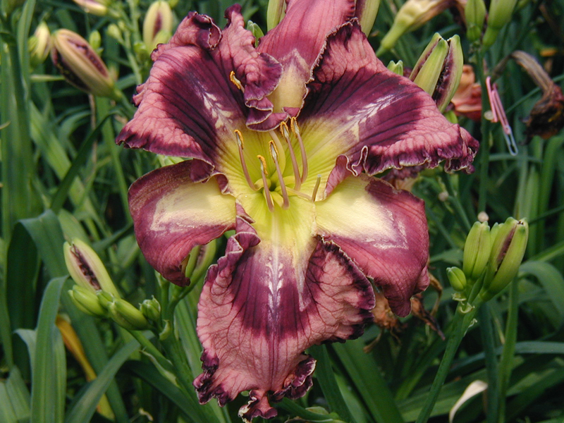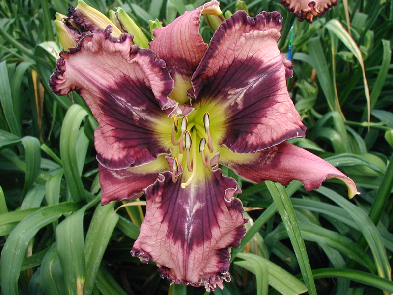 TET 26712 [Gathering of Nations x {(Inscribed on My Heart x Chariot of Clouds) x Entwined in the Vine}] x Trials of Job. 7", 28" (range of 24-30"; 26" some years), 3-way branching (range of 3-6), 15 buds (range of 12-20), ML, Sev, rebloom (but not MN), fr. Lavender pink; burgundy and grape lavender eye (with ivory pattern in cooler weather); triple edge of burgundy and grape lavender and ivory; green throat. Usually a slight reverse bitone.