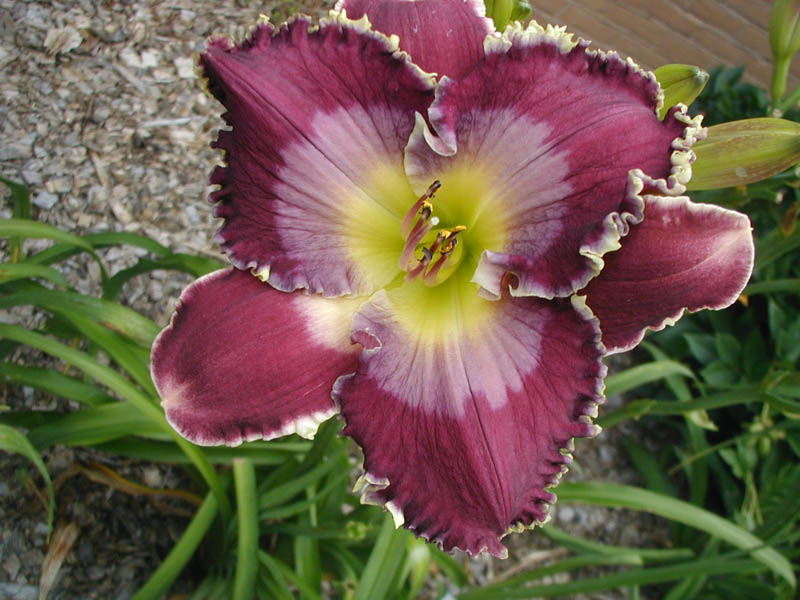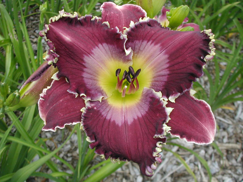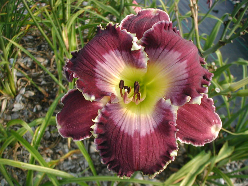 TET 41112 (sdlg x Skin of My Teeth), where the seedling includes things like Chariot of Clouds, Shores of Time, Heartbeat of Heaven, Remembering Joan, Rock of Salvation, and Gnashing of Teeth. 6" (range of 5.5-6.5"), 36" when mature (and some years 40"), 5-way (range of 3-7 way in a given clump), 26 buds (range of 17-42 in a clump), M, Dor, fr, Minnesota instant rebloom on half the fans. Beautiful clear saturated Welch's grape; lavender eye and edge plus silver and ivory wire and has white sharks unless it is cool weather (picture 1); yellow to green throat. It took me 5 years to notice that although it is a good opener it can take until 9AM to open on cold mornings, and there is also a small area without color at the end of each sepal. It is easily fertile both ways and a wonderful parent for hardy flowers with saturated color, chalky eyes, fancy edges, and good scapes.