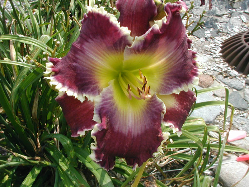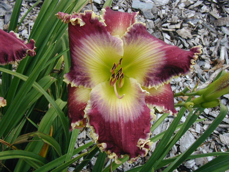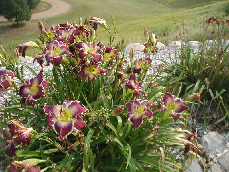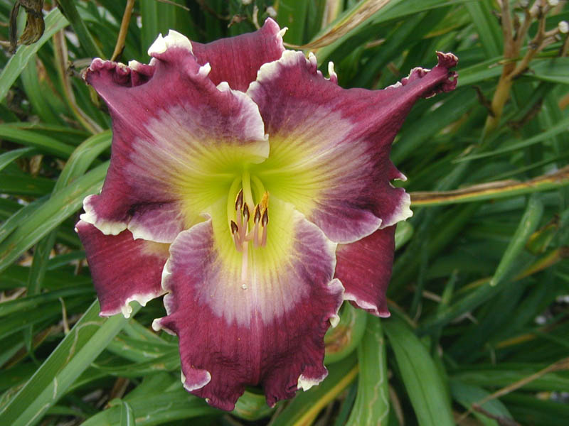 TET 49312 (Broken Chains x sdlg), where the seedling includes things like Heartbeat of Heaven, Gnashing of Teeth, Not Guilty, Chariot of Clouds, Skin of My Teeth, All Things to All Men. 6", 28" (30" in 2018), 3-way branching (range of 2-6 way in a given clump, and 3.6 way avg. in 2018), 16 buds (range of 12-24 in a clump), ML, Sev (I think), fr, some Minnesota instant rebloom. Grape cranberry; gray lavender eye and edge plus ivory teeth; chartreuse throat. Some photos look a lot like its parent Broken Chains, but in person it has its own look, and it has different looks on different days as you can see. It is a very hardy plant and a good increaser. Not yet used as a parent as it was first flagged outside and left for testing, but based on its very fertile parents and looking at the pollen and the grasshopper pods I would say it is fertile both ways.
