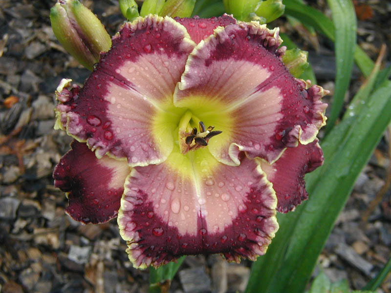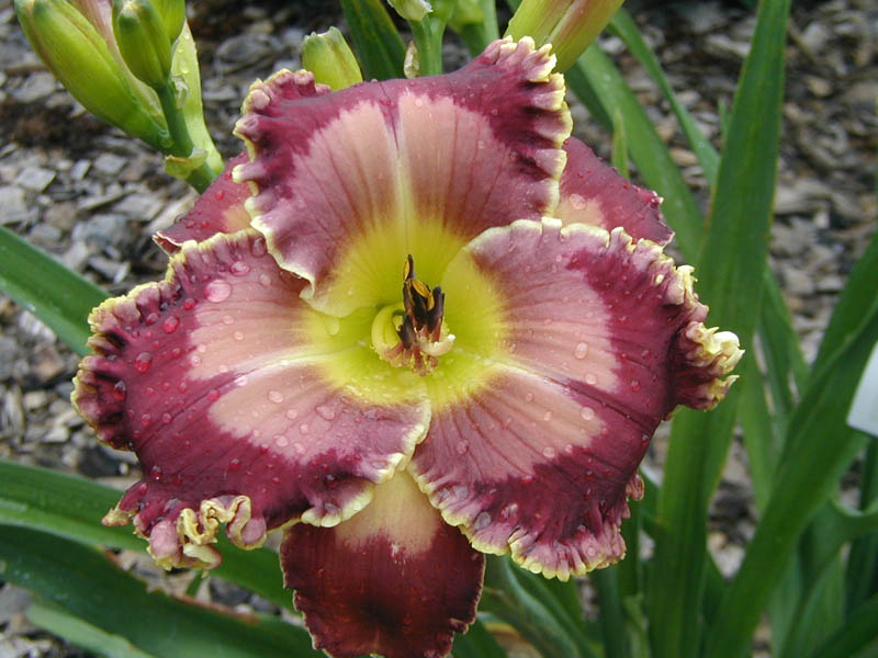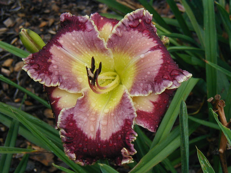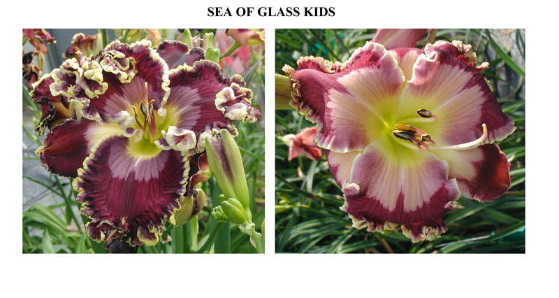 TET 24712 Desire of Nations x {sdlg x [(Storm Shelter x Jane Trimmer) x All Things to All Men]}. 5.5", 26", 4-way, 22 buds (some years 5-way and 26 buds or 3-way and 18 if crowded), ML, Dor, fr, some to lots to almost all fans with instant rebloom in Minnesota depending on the year. Cold morning opener - one of the best in the garden at 50 degrees after rain. Flawless, consistent blooms. Cranberry grape (darker in cool temps as you can see in these pictures); icy gray lavender eye and edge plus ivory; yellow to green throat. Very distinctive color combination, and the indented/notched eye gives it even extra personality and is passed on to offspring. Fertile both ways, and it is the parent of one of the best parents I have ever bloomed - a future numbered 18014. I didn't use Sea of Glass much when it first bloomed in the GH since I couldn't figure out how to make it better, and I also didn't believe anything that beautiful would thrive in Minnesota so what was the point of making crosses - dumb me- and then it was sent outdoors for testing where I don't make crosses. I'm looking forward to seeing lots of its kids in 2019.