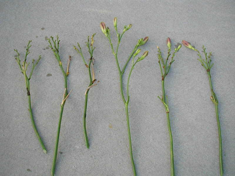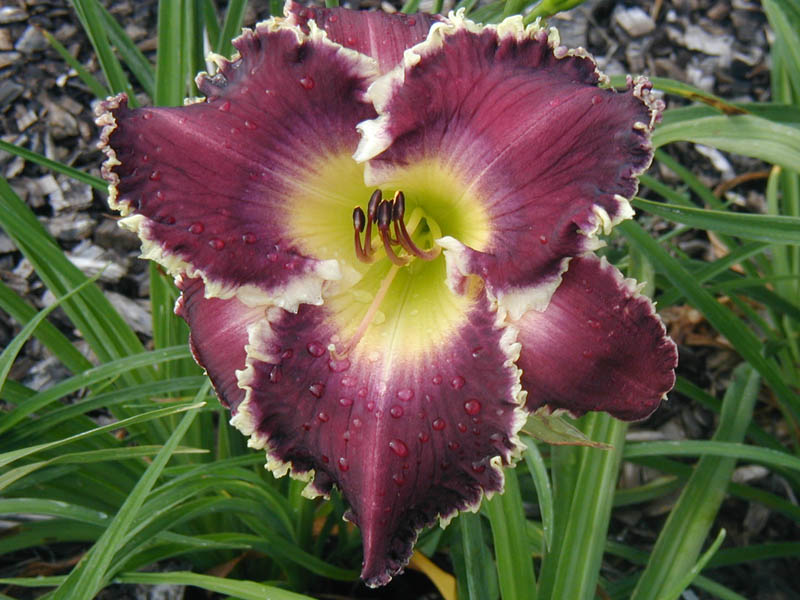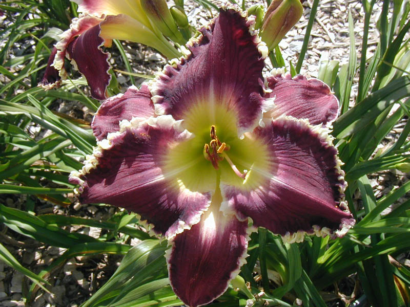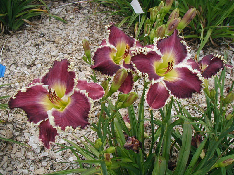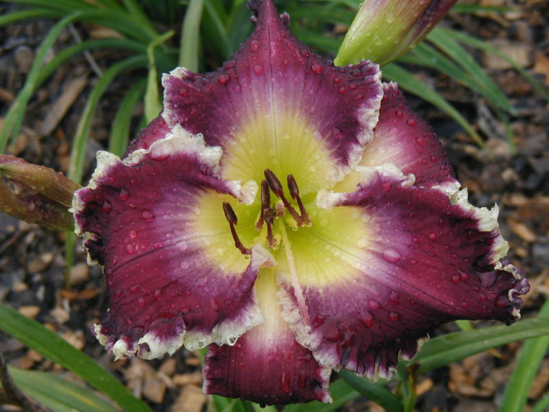 TET 41913 {[(Gnashing of Teeth x sdlg) x Soli Deo Gloria] x Terrible Swift Sword}. 7", 33" when mature, 4-way with beautifully spaced laterals, 19 buds, M, Sev, fr, instant rebloom in Minnesota on almost all fans, EMO and easy opener even when nights are in the 50's. Cranberry grape; grape and dark lavender eye and edge with white sharks; yellow to green throat. As you can see, this flower has several different looks, and I like them all - picture 1 is on its sharkiest day. Nice parent and fertile both ways.