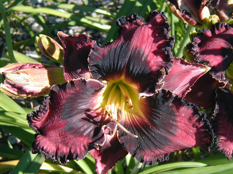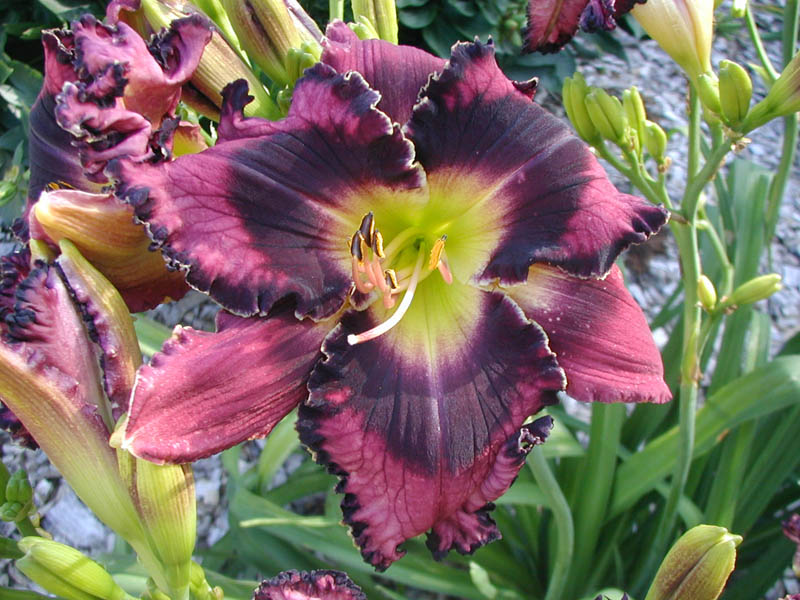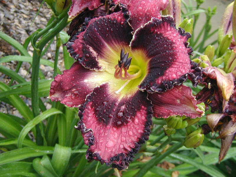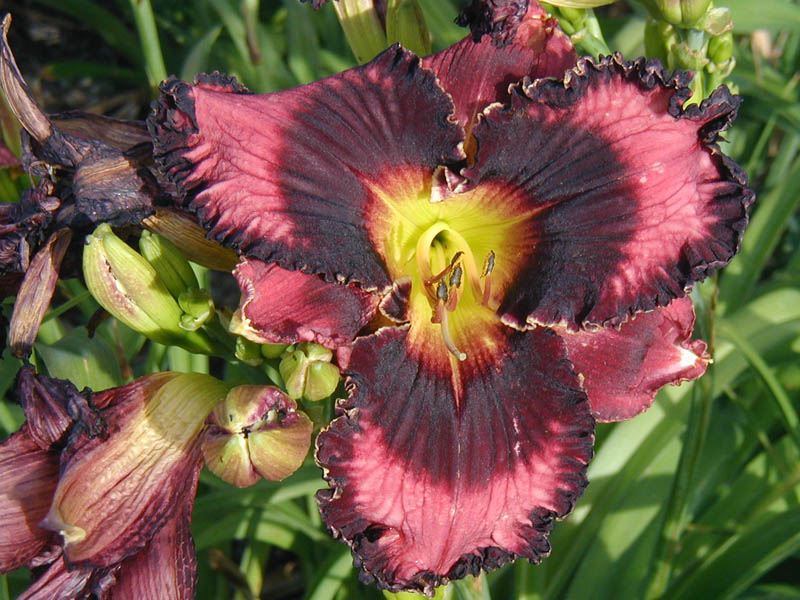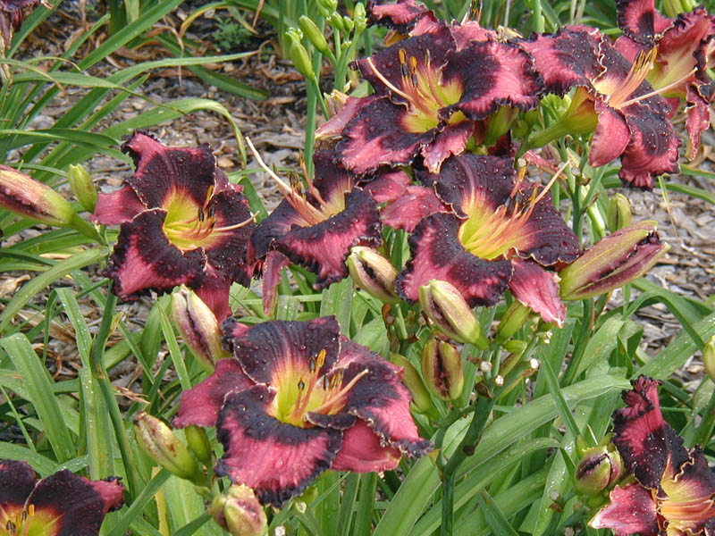 TET 7912 {[sdlg x (sdlg x Inscribed on My Heart)] x Trials of Job} 6.5" (and sometimes 7"), 30" (36" in one location), 5-way branching with 25 buds (range of 4-6 way and 17-37 buds, but if the spring is terrible or in a poor location it can be 3-way with 10-15 buds), EM, Sev, fr, instant Re in MN on almost all fans, EMO. Dark pink; merlot eye and edge plus ivory wire; green throat. Looks great when planted next to Solemn Oath. Fertile both ways and a good parent and grandparent for bold eyes.