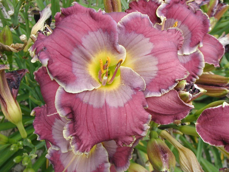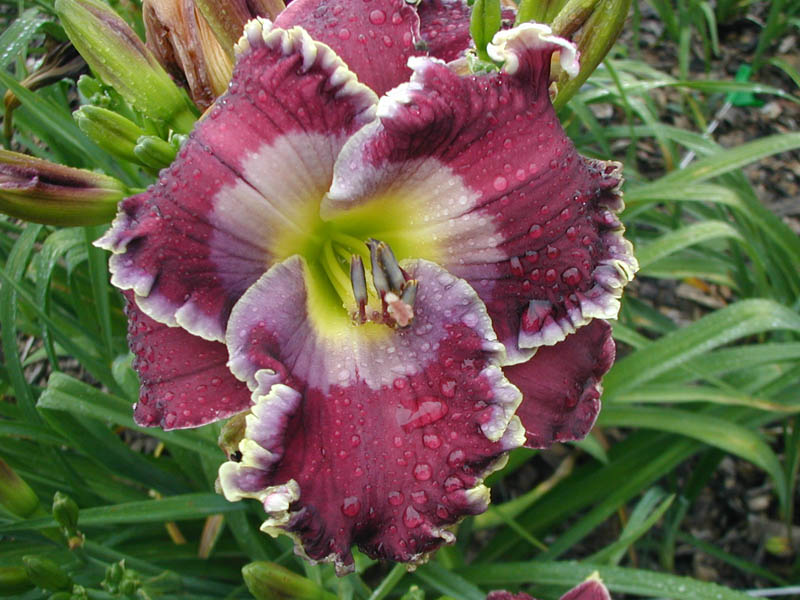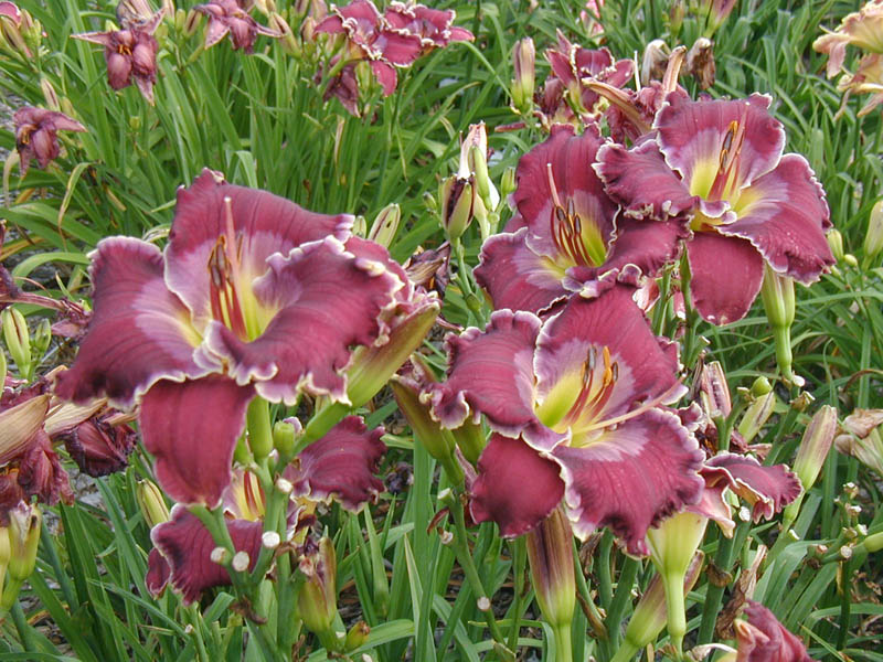 ALL THINGS MADE NEWTET 24813 (All Things to All Men x Bluegrass Memories), 5.5" (sometimes 5"), 33" (30" some years and 36" others), 4-way branching (range of 2-5 way in a given clump), 18 buds (range of 9-27), M, Sev, fr, instant Re in MN every once in a while on some fans. Grape cranberry; icy lavender eye and edge plus ivory white; yellow to green throat. Color changes with different temperatures - sometimes many shades lighter and other times much darker. A darker version of All Things to All Men (without the spotting). Fertile both ways |