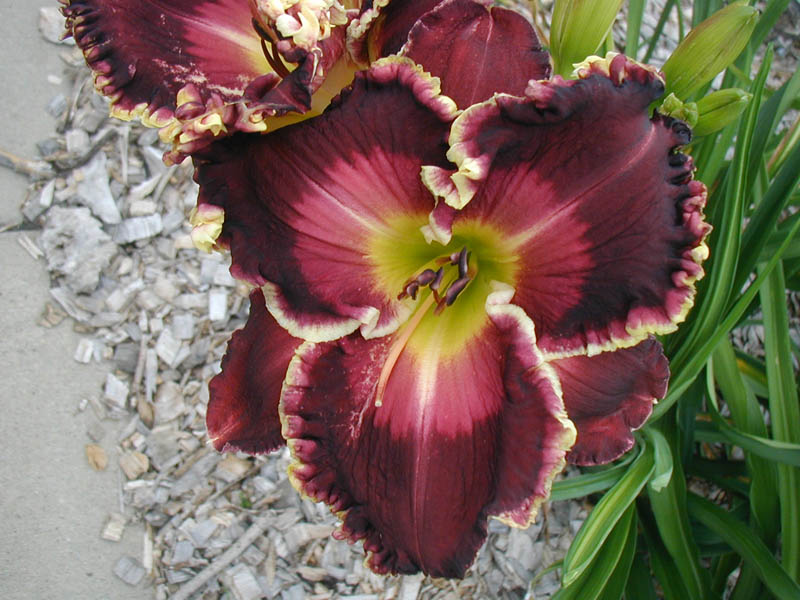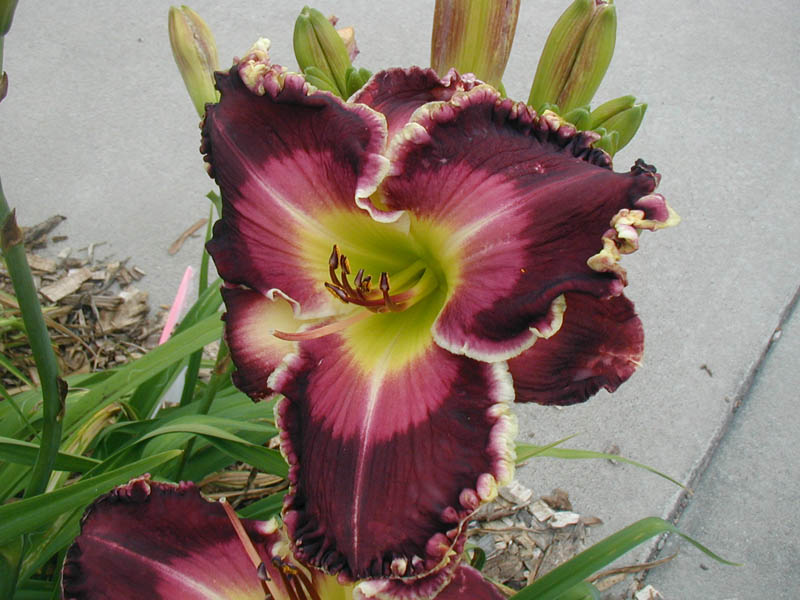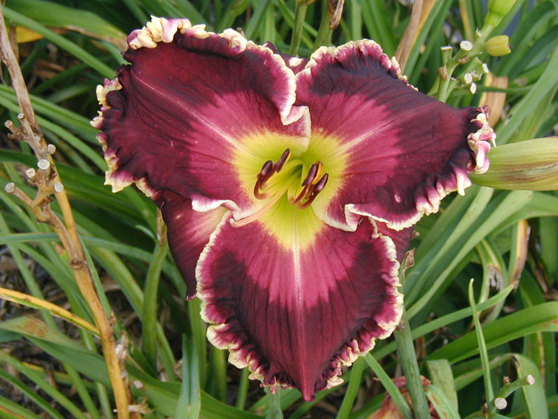 BLOOD OF THE MARTYRSBLOOD OF THE MARTYRS TET 22914 (Soli Deo Gloria x sdlg 8912) x (Soli Deo Gloria x sdlg 18010), where the seedlings include things like Desire of Nations, Faith That Moves Mountains, Not Guilty, All Things to All Men, Storm Shelter, Jane Trimmer, Trials of Job. 6.5", 32" (with range of 28-36"; 24" in first year after planting), 4-way branching (range of 3-5, with buds near the top of the scape but no crowding), 17 buds (range of 13-21), M, Sev, EMO, fr, Re (but not MN). Black cranberry; lavender pink eye and edge plus ivory; twinkle midribs, yellow to green throat. Fertile both ways, making beautiful dark kids with great color.