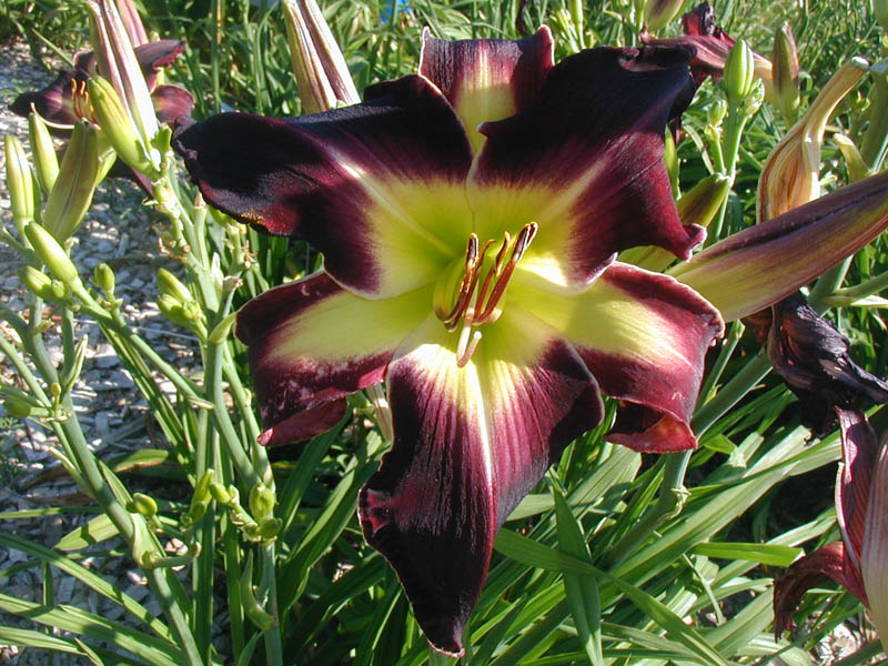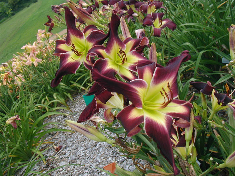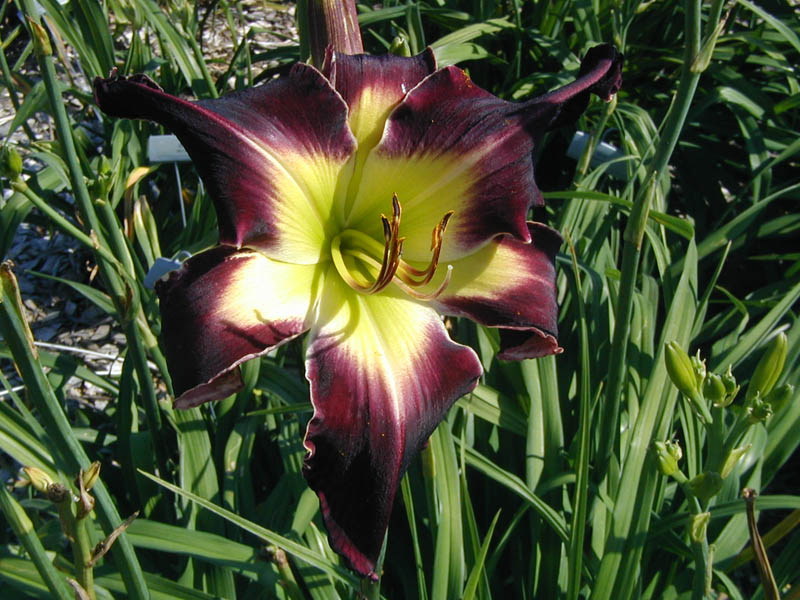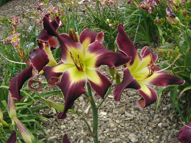 MIGHTY IN BATTLETET 3313 (seedling 0412 x Flying Purple People Eater), where the seedling includes things like Not Guilty, Faith That Moves Mountains, Chariot of Clouds, Skin of My Teeth. 8", 40", 5-way branching, 25 buds (range of 10-35 and closer to 15 when crowded), EM, Sev, very fr, tons of MN instant Re (50-100% depending on the year). Good increaser that blooms here from July 10 through early September because of the rebloom. Pinched crispate UF - pinched petals, triangular form, sometimes twisting. Very dark cranberry grape, although it can also be cranberry merlot or dark cranberry or merlot depending on the weather; 1/3 midribs, white edge, green throat. Unspotted. Fertile both ways (and easily pod fertile in the greenhouse, which is sometimes not the case for UF's).