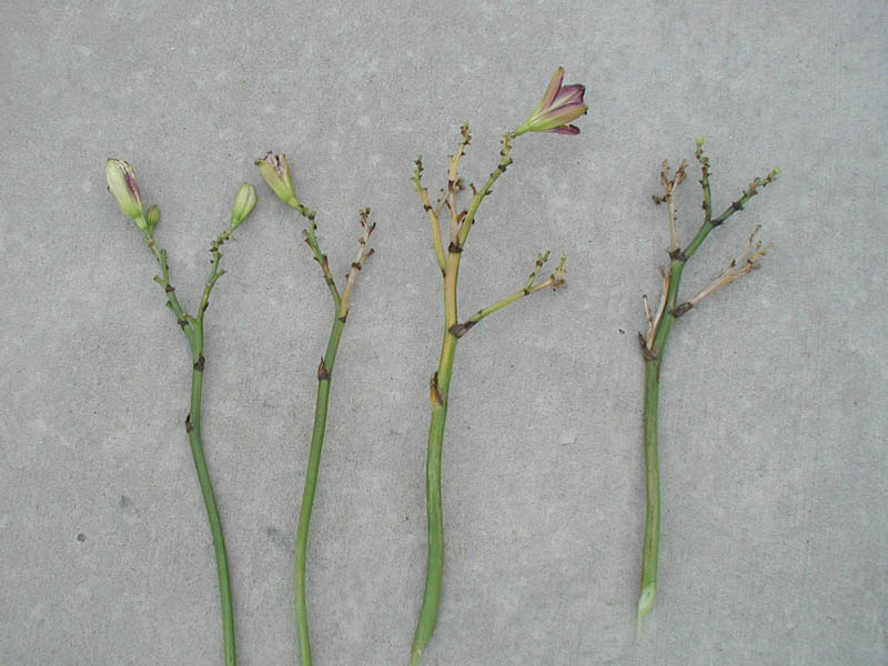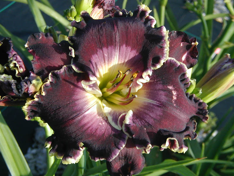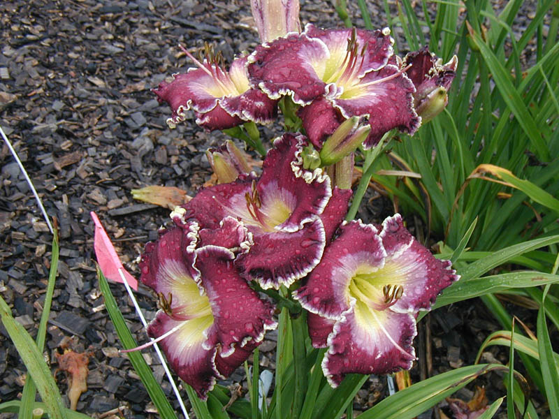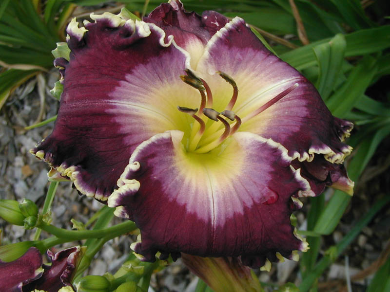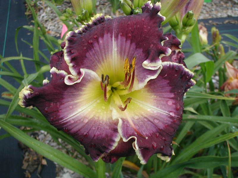 POWER MADE PERFECTTET 50412 [Soli Deo Gloria x (sdlg x All Things to All Men)]. 6", 28" (range of 26-30"), 3-way branching (range of 3-5), 24 buds (range of 13-35 - a bud builder), ML (and blooms into September here), Dor, fr, Re (but not MN), CMO (great when cold days or nights), EMO. Clear, saturated purple wine; icy lavender eye and edge plus ivory white; yellow to green throat. Different looks depending on the weather - eyezone can be bigger and icier and color can get darker. Thick substance; gorgeous flower. Makes huge fans outside. Fertile both ways. Always an "outside" flower so haven't bred with it until last year. I think its kids will be great.
